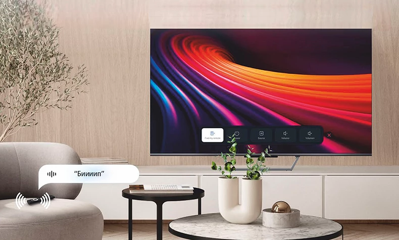Кроме того, в корпусе телевизора тоже предусмотрен микрофон, он принимает голосовые команды, если пульт находится в другой комнате или кармане. Кстати, найти его позволяет функция поиска, активирующая встроенный вибромотор. Для этого достаточно зажать кнопку на телевизоре, после чего выбрать “Поиск пульта ДУ”.