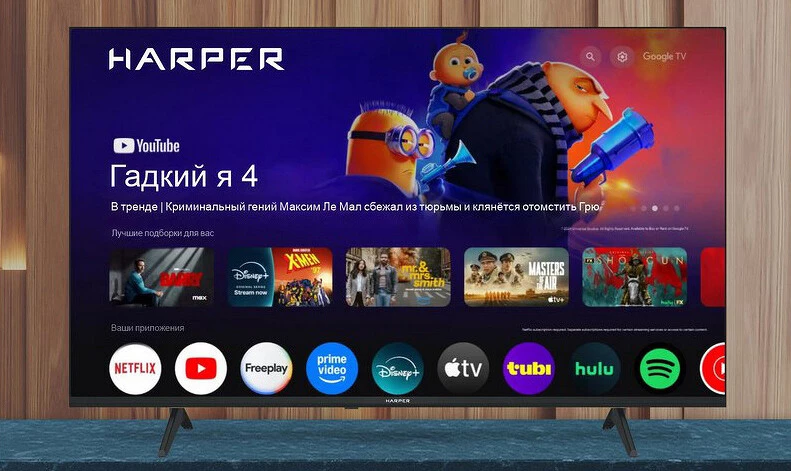 «Сердцем» телевизора HARPER 55Q970TS является 4-ядерный ARM-процессор Cortex A55. Ему доступно 2 Гбайт оперативной памяти и 16 Гбайт на встроенном накопителе. Сегодня это необходимый минимум для нормальной работы базовых программ. Если предполагается установка большого количества приложений или загрузка фильмотеки, можно подключить флешку. Также есть возможность транслировать изображение с iPhone, iPad и Mac благодаря функции Airplay, для Android-устройств есть Chromecast.