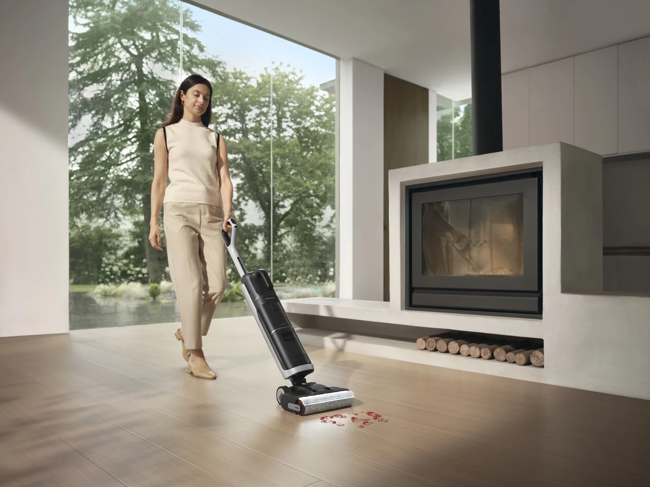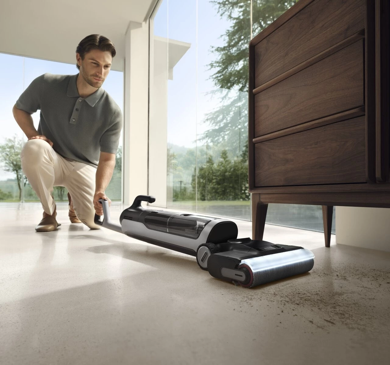 Влажная уборка осуществляется отдельной насадкой с электрической роликовой щеткой, которая промывается чистой водой, тогда как эластичный скребок удаляет грязную воду. Резервуар для воды объемом 400 мл встроен прямо в насадку: такого количества воды хватит на уборку в течение 40 минут, при этом максимальное время работы от аккумулятора составляет 90 минут.