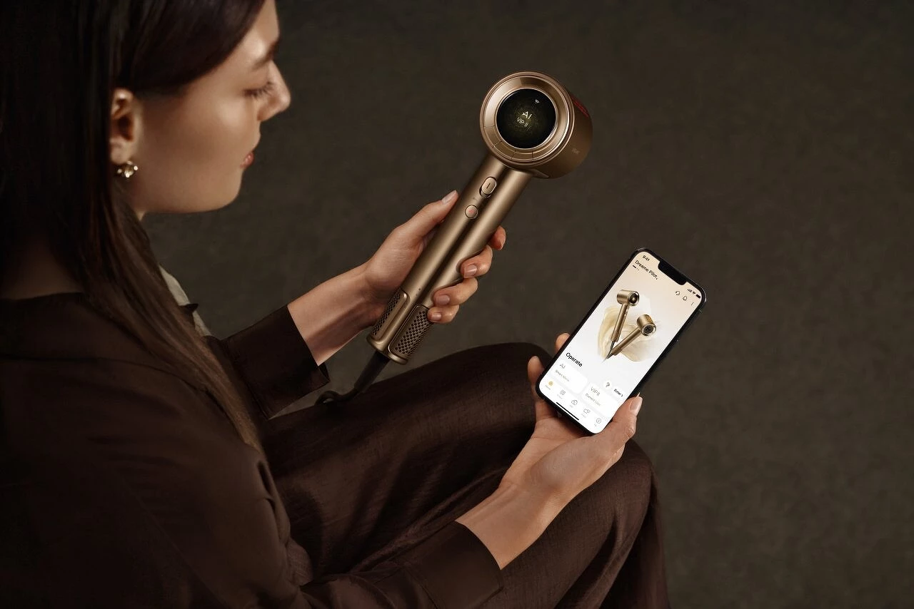 Это первый умный фен компании, который оснащен модулем Wi-Fi и имеет поддержку ИИ. Расширенные настройки доступны в мобильном приложении. Например, прибор запоминает параметры использования, дает советы по улучшению ухода за волосами, предлагает подходящие укладки.