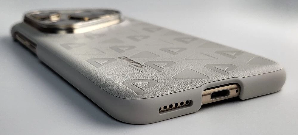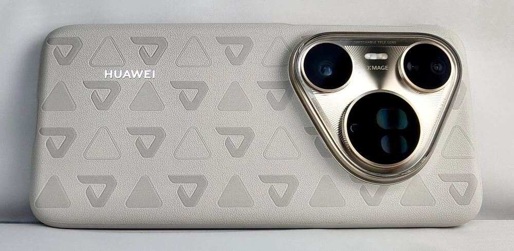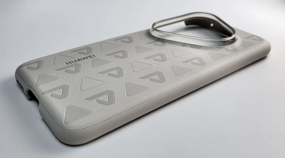 В комплекте идет симпатичный защитный чехол, который отлично сочетается с открытым модулем камер. Он выполнен из плотного бежевого пластика с тиснением под кожу и узором в виде стилизованных треугольных монограмм Pura. Он достаточно шершавый и упрощает эксплуатацию смартфона.
