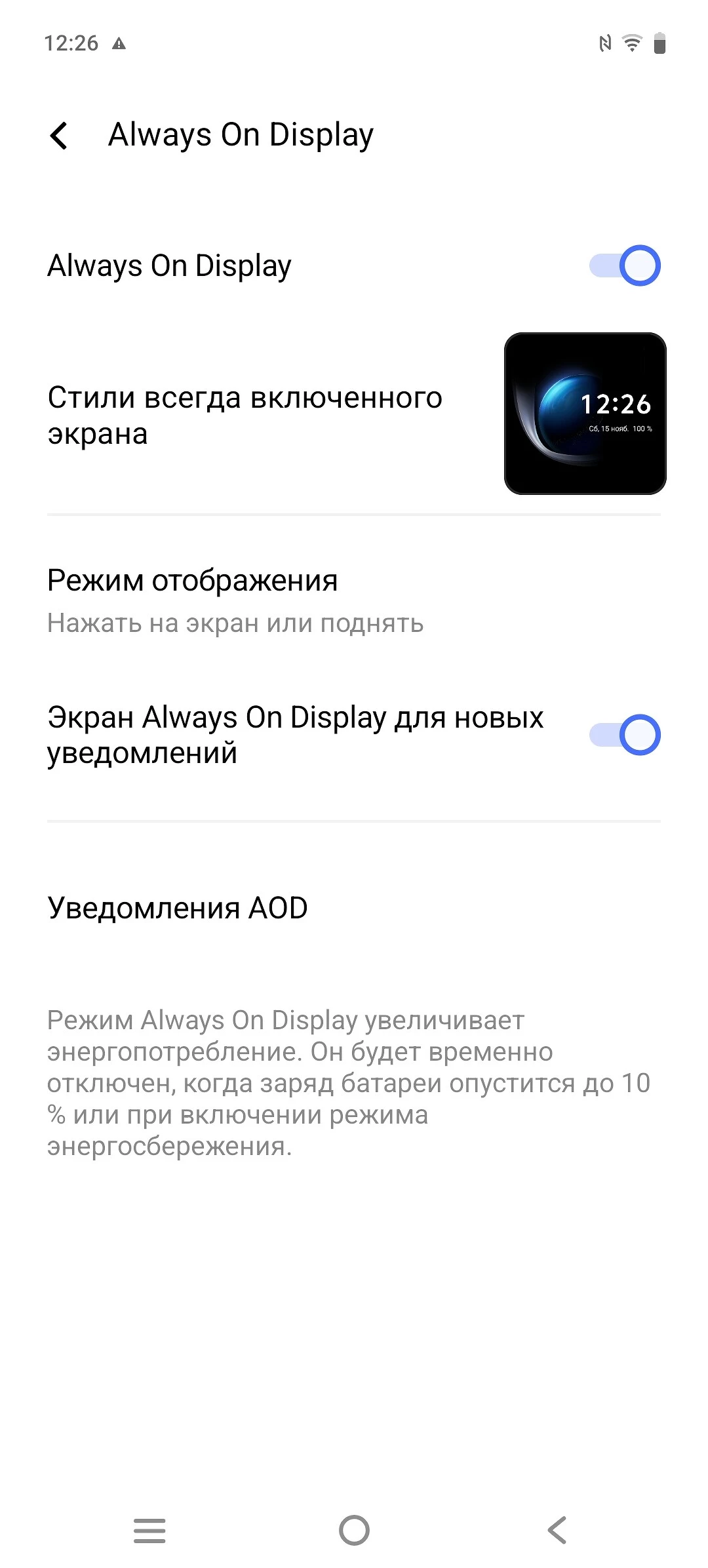 Поддерживается режим постоянно включенного дисплея (AOD). При его использовании на неактивном экране выводится небольшое изображение, порой, даже анимированное, обычно с часами и датой, а также пиктограммы или оповещения от выбранных заранее приложений. Это практично и выглядит очень хорошо, при этом не сказывается критически на времени работы устройства.
