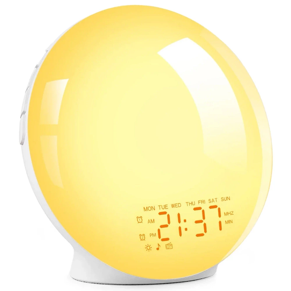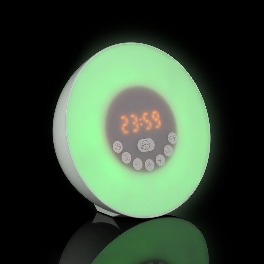 Это настольный будильник с LED-подсветкой, который сочетает несколько функций: часы, будильник, ночник и имитацию естественного рассвета или заката.