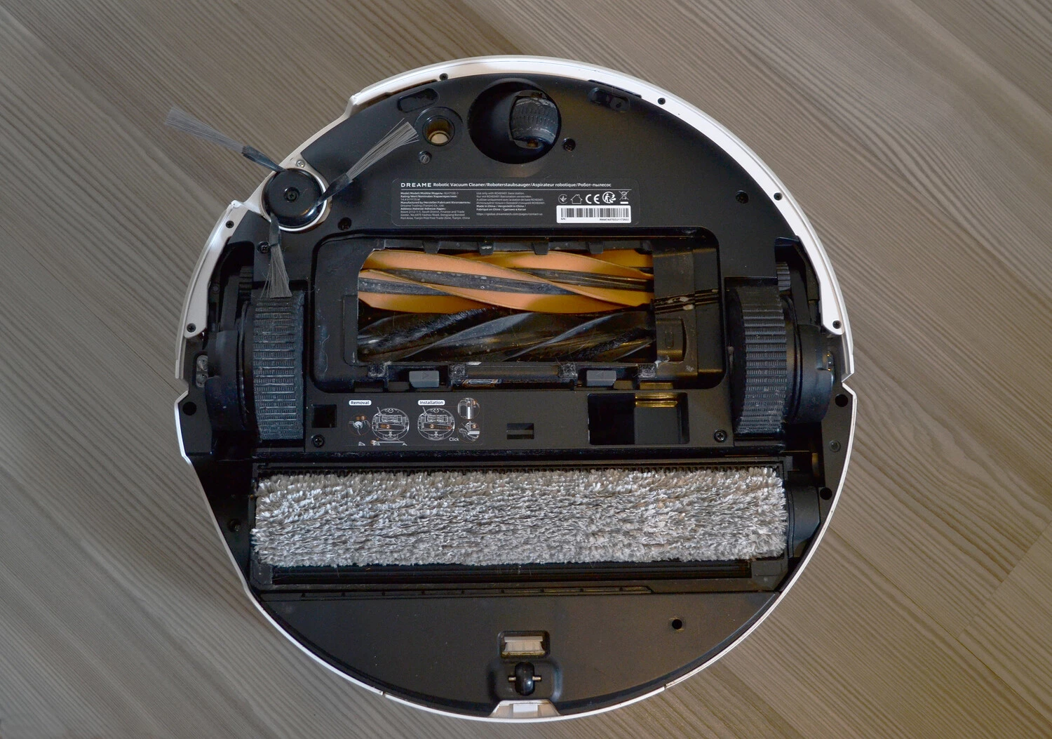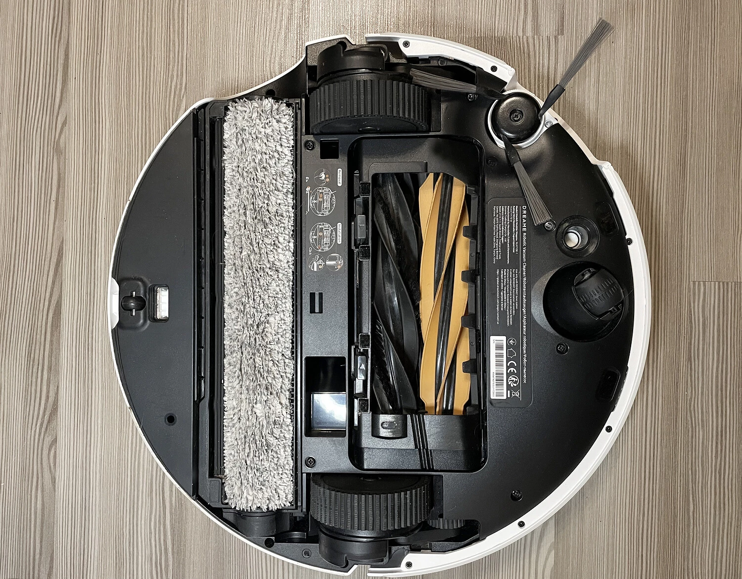 Внизу собраны датчики перепада высоты, чтобы робот не упал с лестницы или высокого подъема, и обнаружения ковров. Тут же внизу — роликовая швабра, система HyperStream™ с двумя щетками, боковая щетка с «усиками» и система ProLeap™ c роботизированными выдвижными ножками для подъема на пороги.