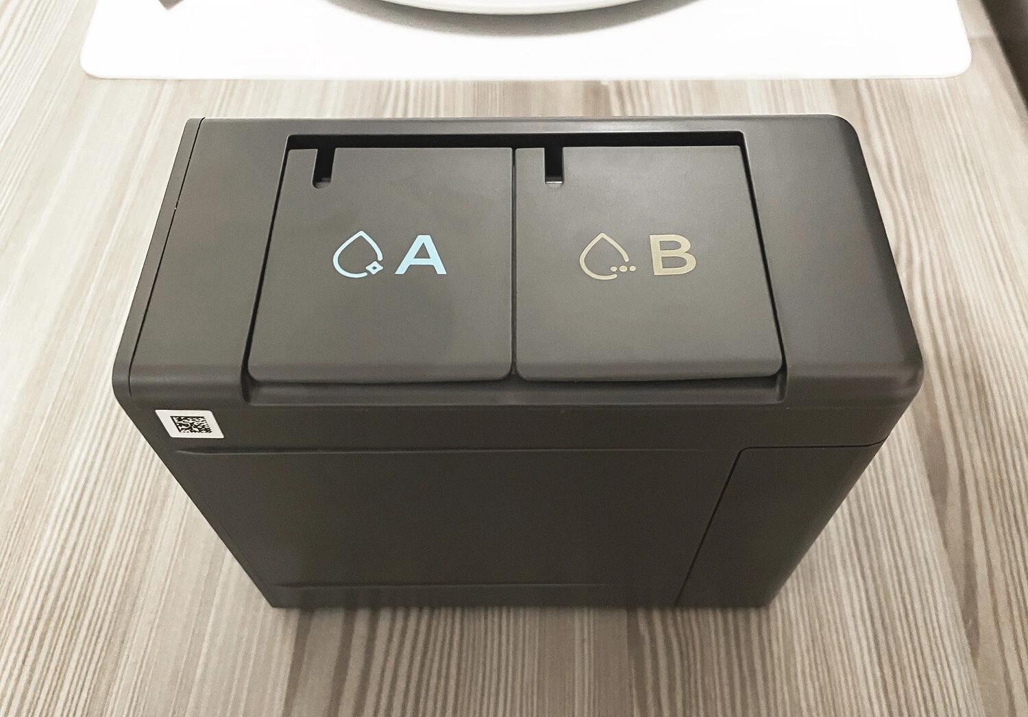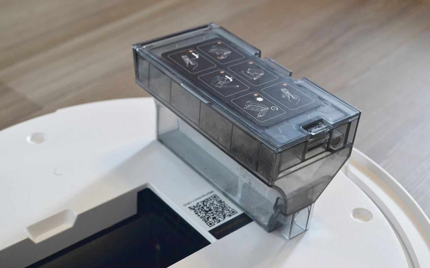 Верхняя крышка на магнитах, она снимается. Под ней — пылесборник объемом 220 мл и QR-код для подключения устройства к Wi-Fi. В пылесборнике спрятан HEPA-фильтр. И контейнер, и фильтр можно мыть, но последний важно хорошо просушить перед установкой.