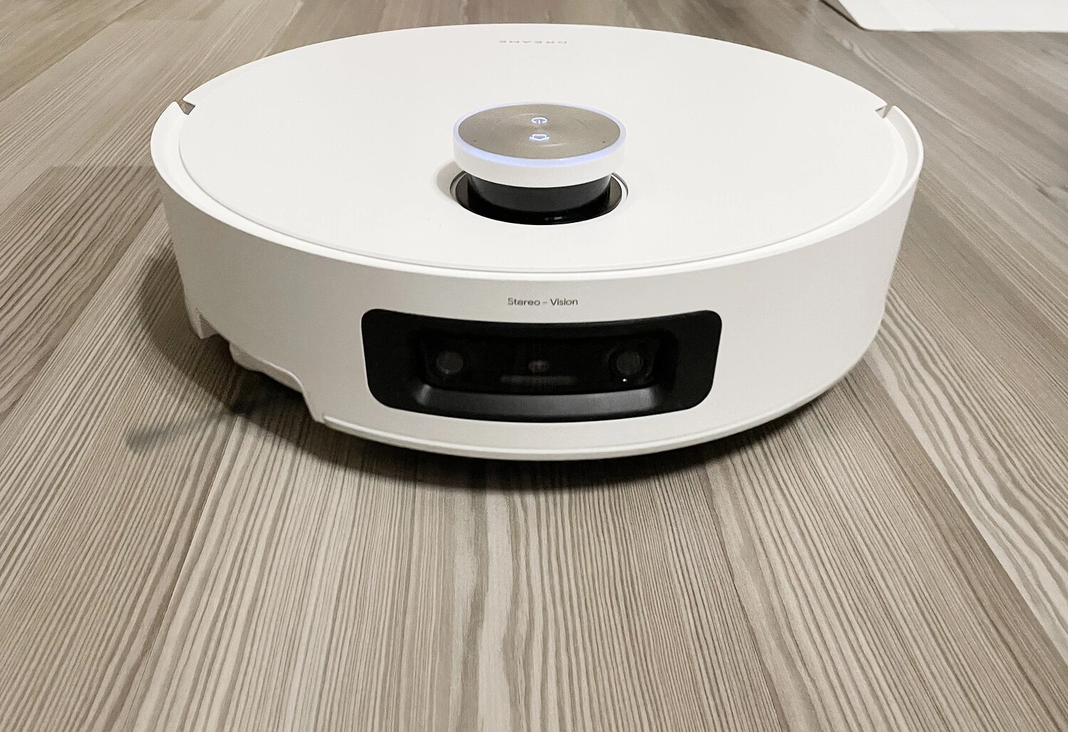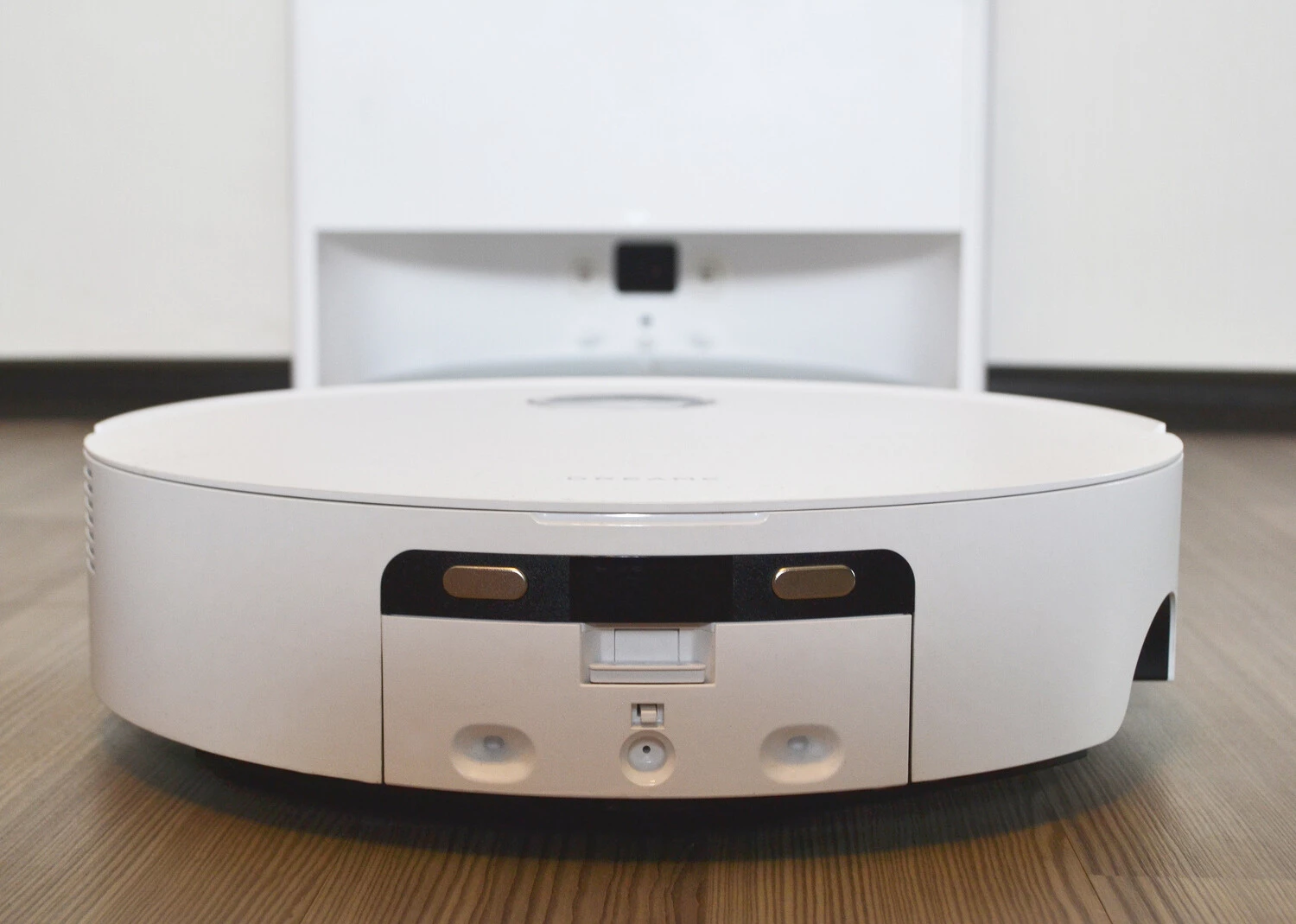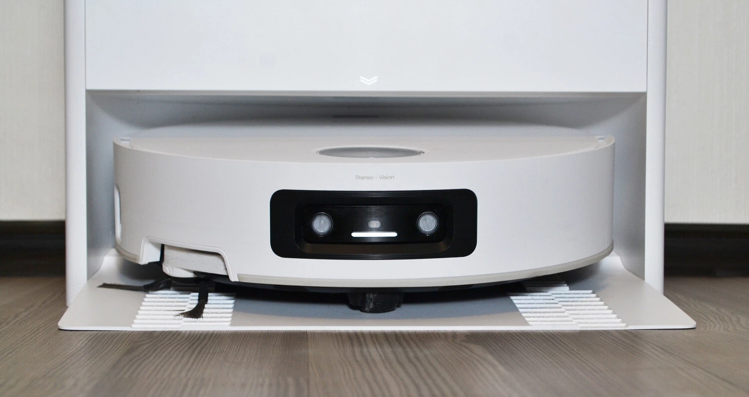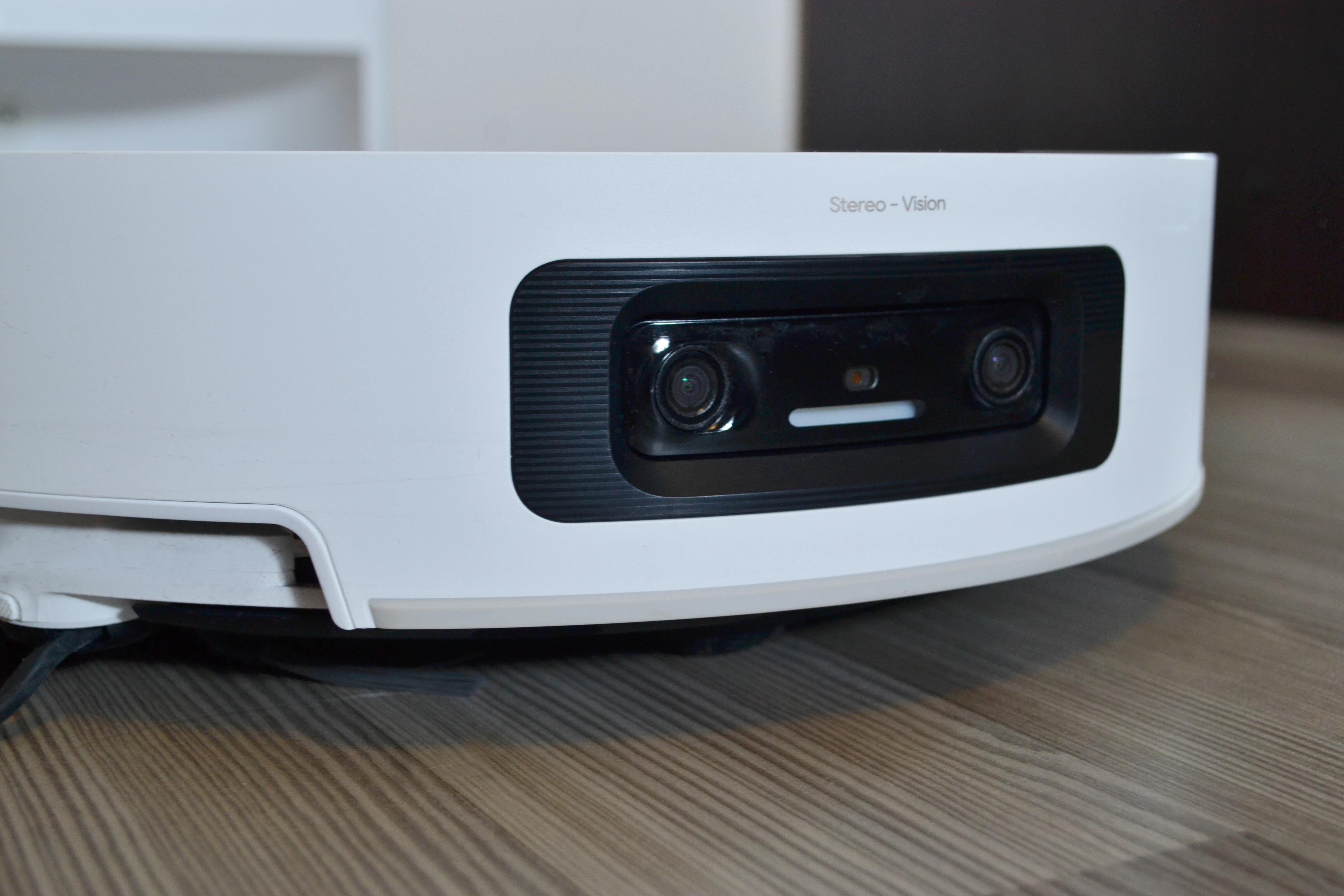 Спереди расположена двойная 3D?камера с подсветкой (система Stereo Vision), она отвечает за распознавание объектов и препятствий на пути пылесоса и, соответственно, за то, чтобы робот аккуратно их объезжал. Через камеру также можно следить за домом. Справа на бампере есть датчик стены, который задействуется и для обхода препятствий.