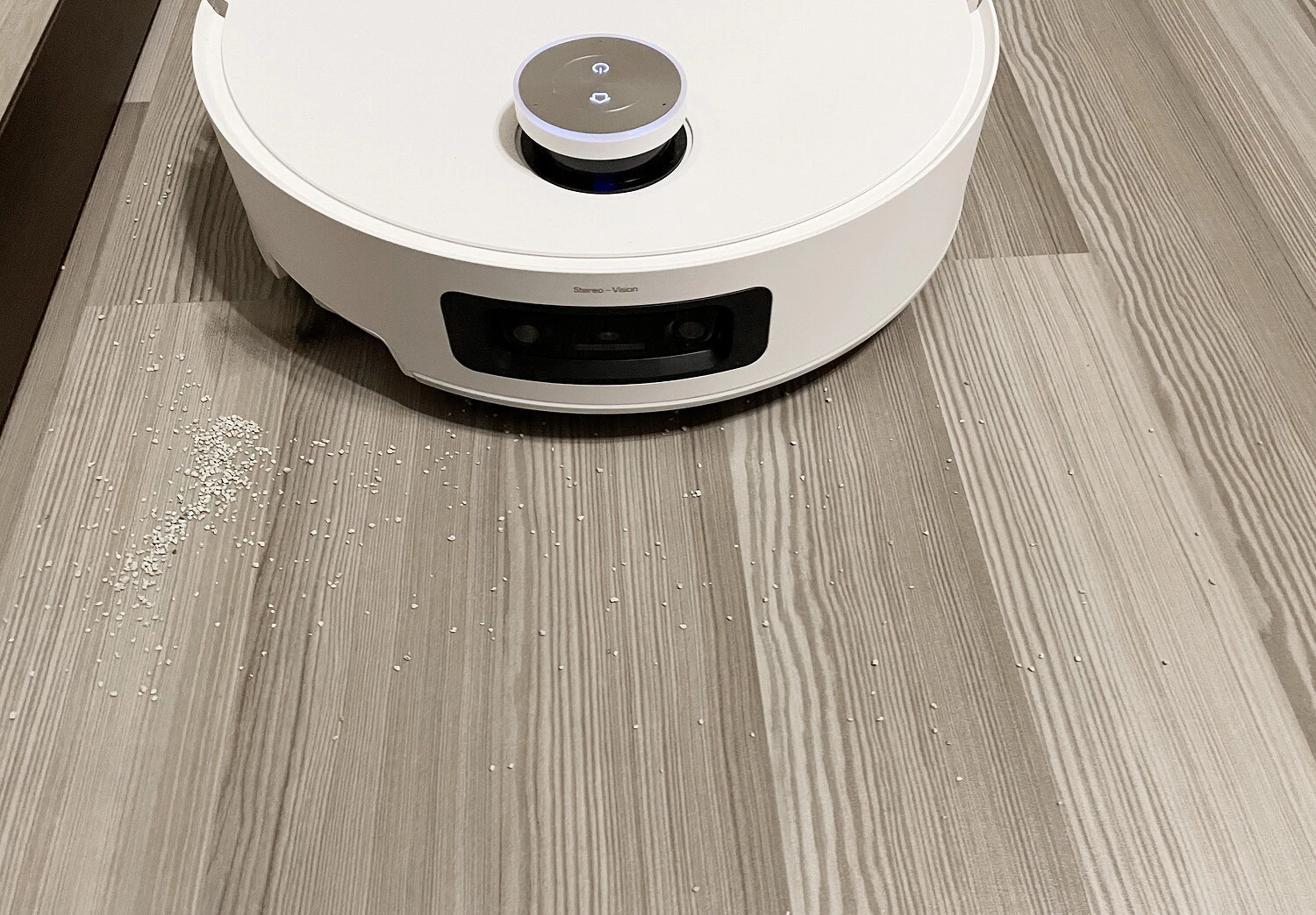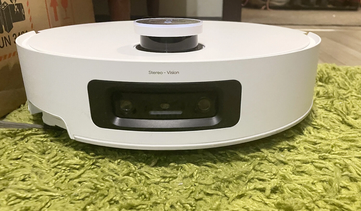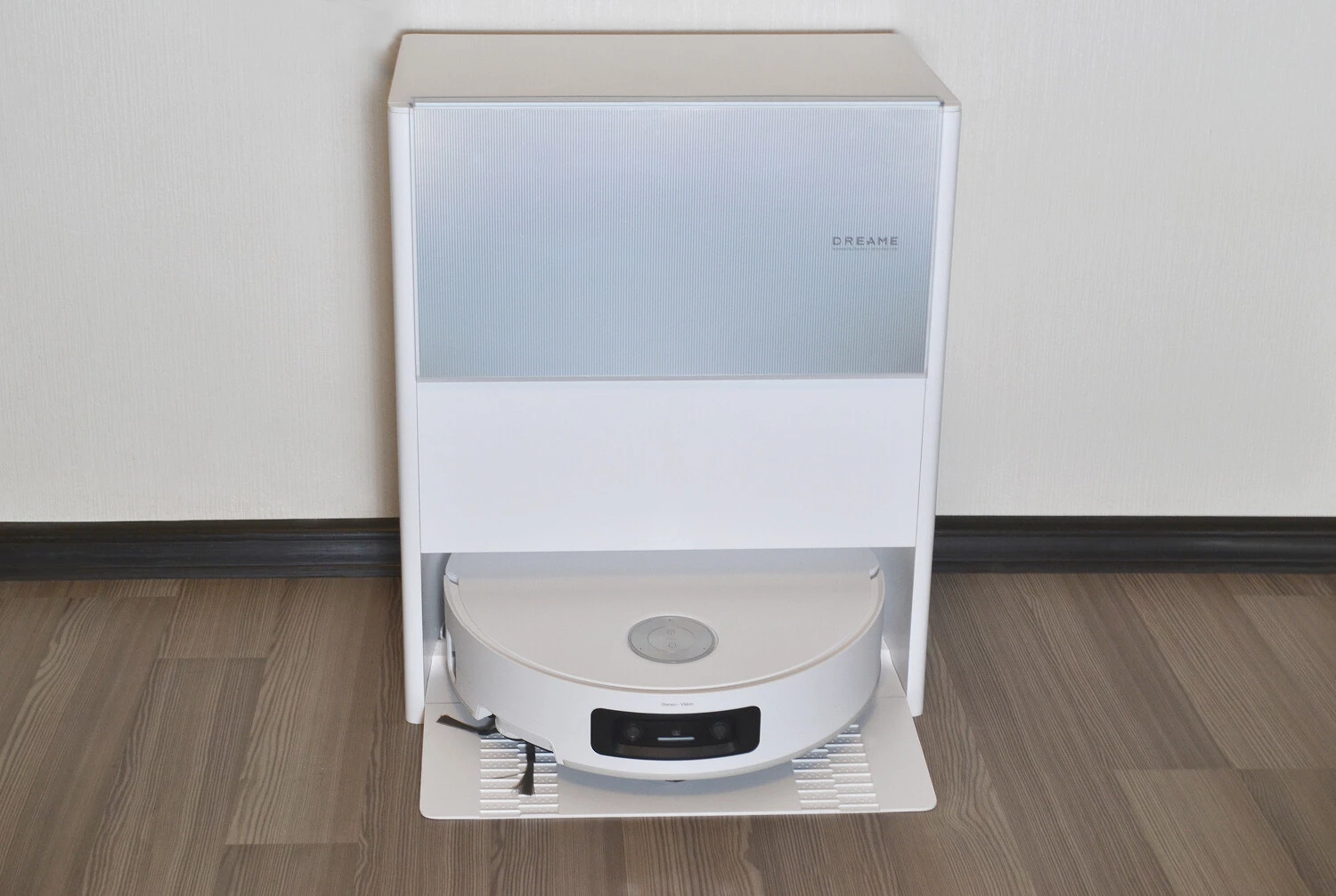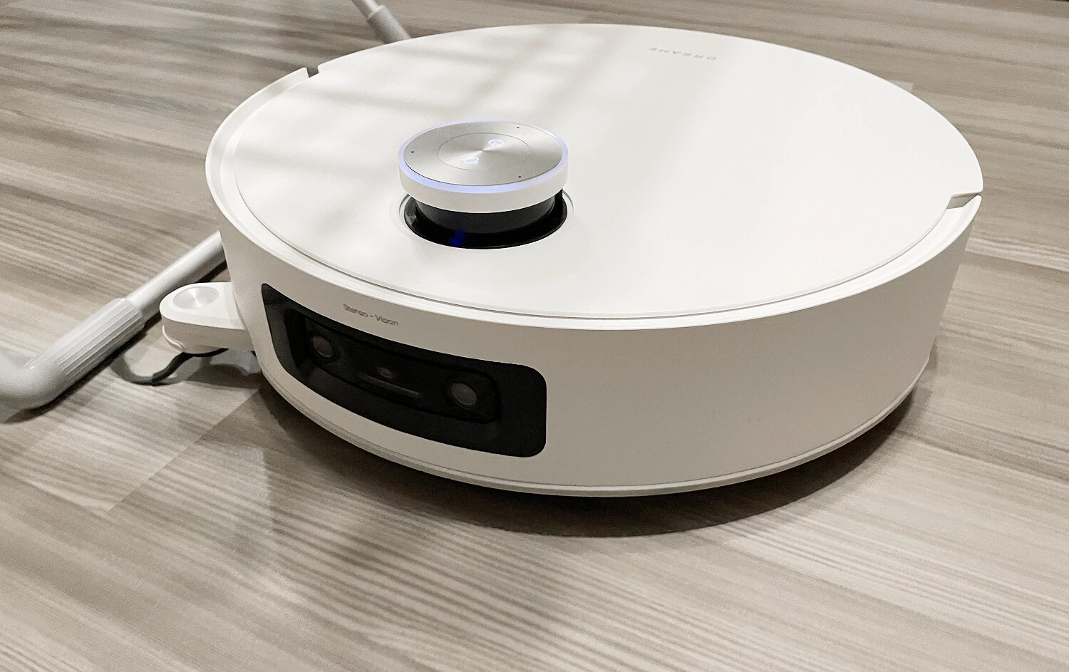Спереди расположена двойная 3D?камера с подсветкой (система Stereo Vision), она отвечает за распознавание объектов и препятствий на пути пылесоса и, соответственно, за то, чтобы робот аккуратно их объезжал. Через камеру также можно следить за домом. Справа на бампере есть датчик стены, который задействуется и для обхода препятствий.