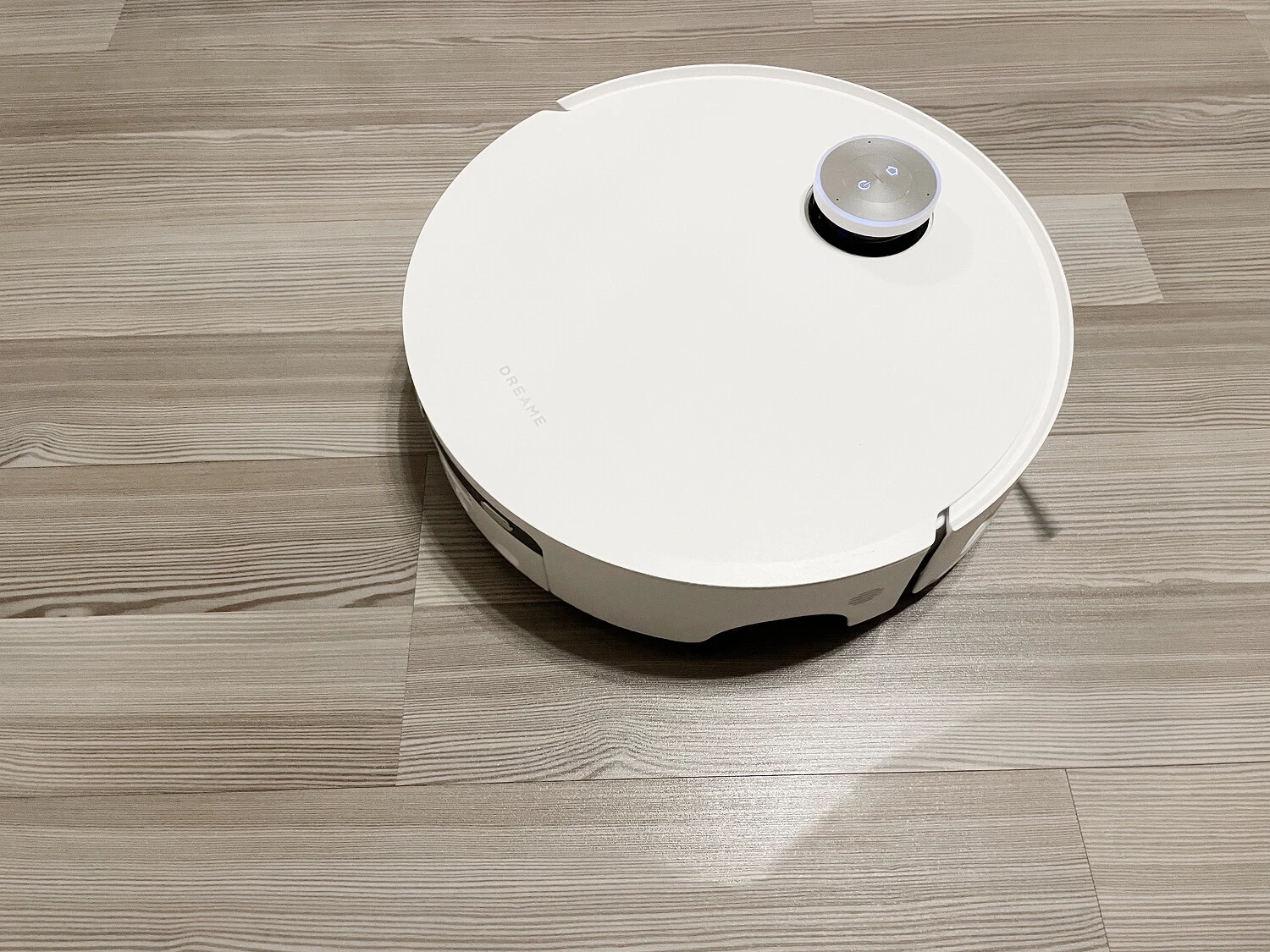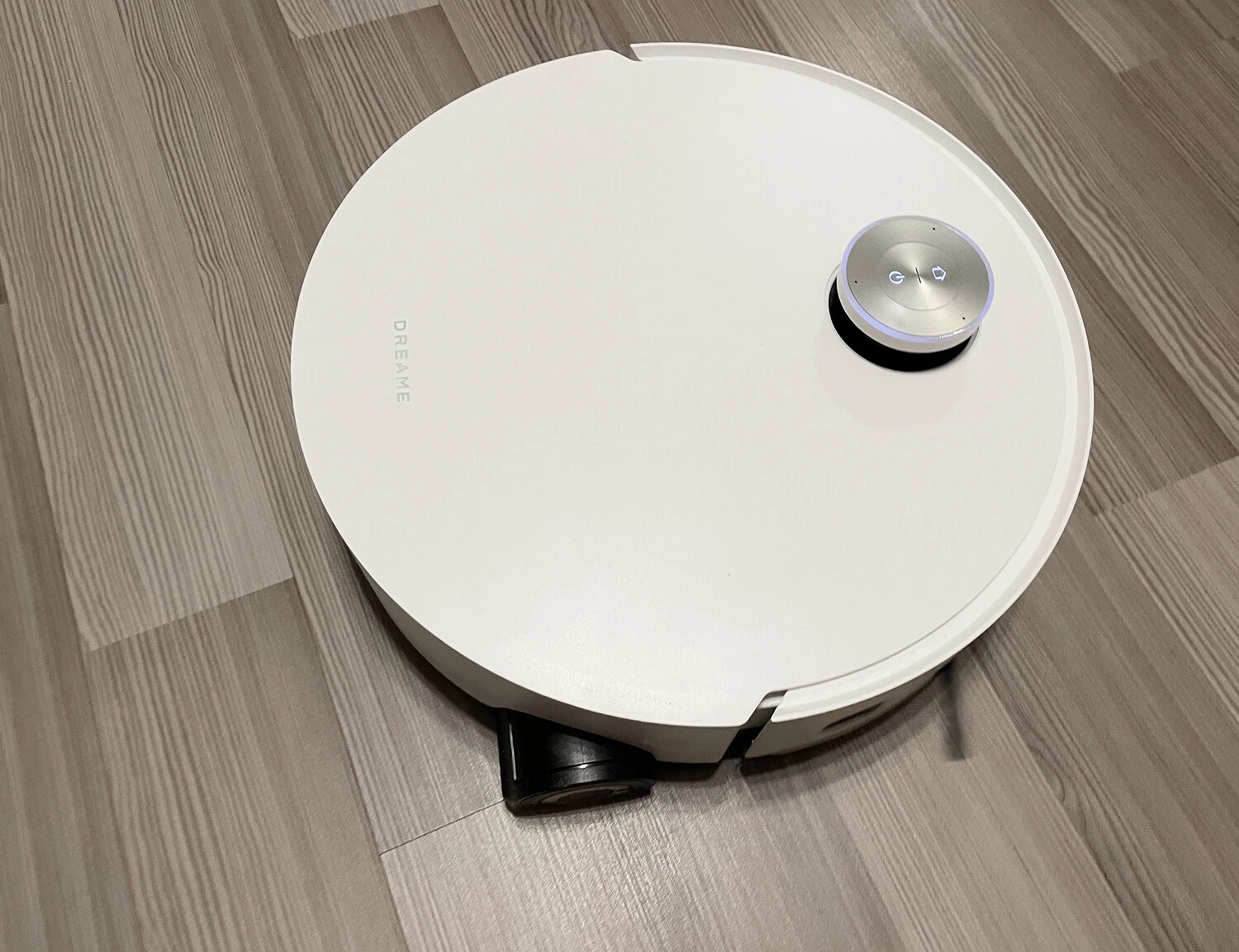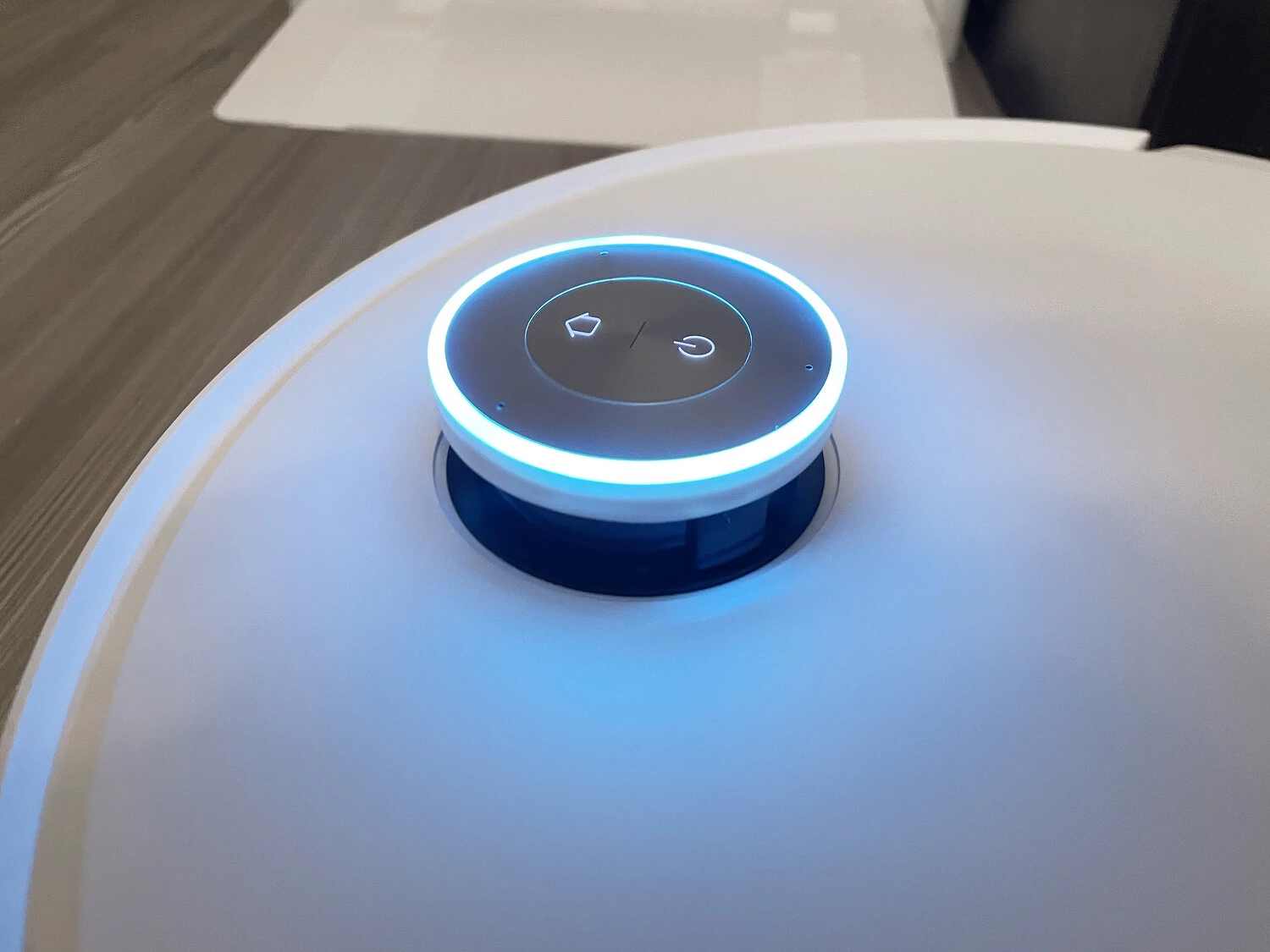 Внешне робот-пылесос выглядит стандартно: круглый белый корпус с утопленной башенкой лидара, которая при необходимости выдвигается вверх. Когда пылесосу нужно заехать под мебель, лидар убирается в корпус — тогда высота последнего составляет 9,75 см, и робот спокойно заезжает под шкаф или диван. Лидар окружен светодиодным кольцом, которое светится голубым или ярко-зеленым светом. Внутри кольца — две кнопки, для запуска уборки и возврата на базу. С поднятым лидаром высота корпуса — уже 12 см. Также сверху расположили три микрофона для работы голосового помощника.