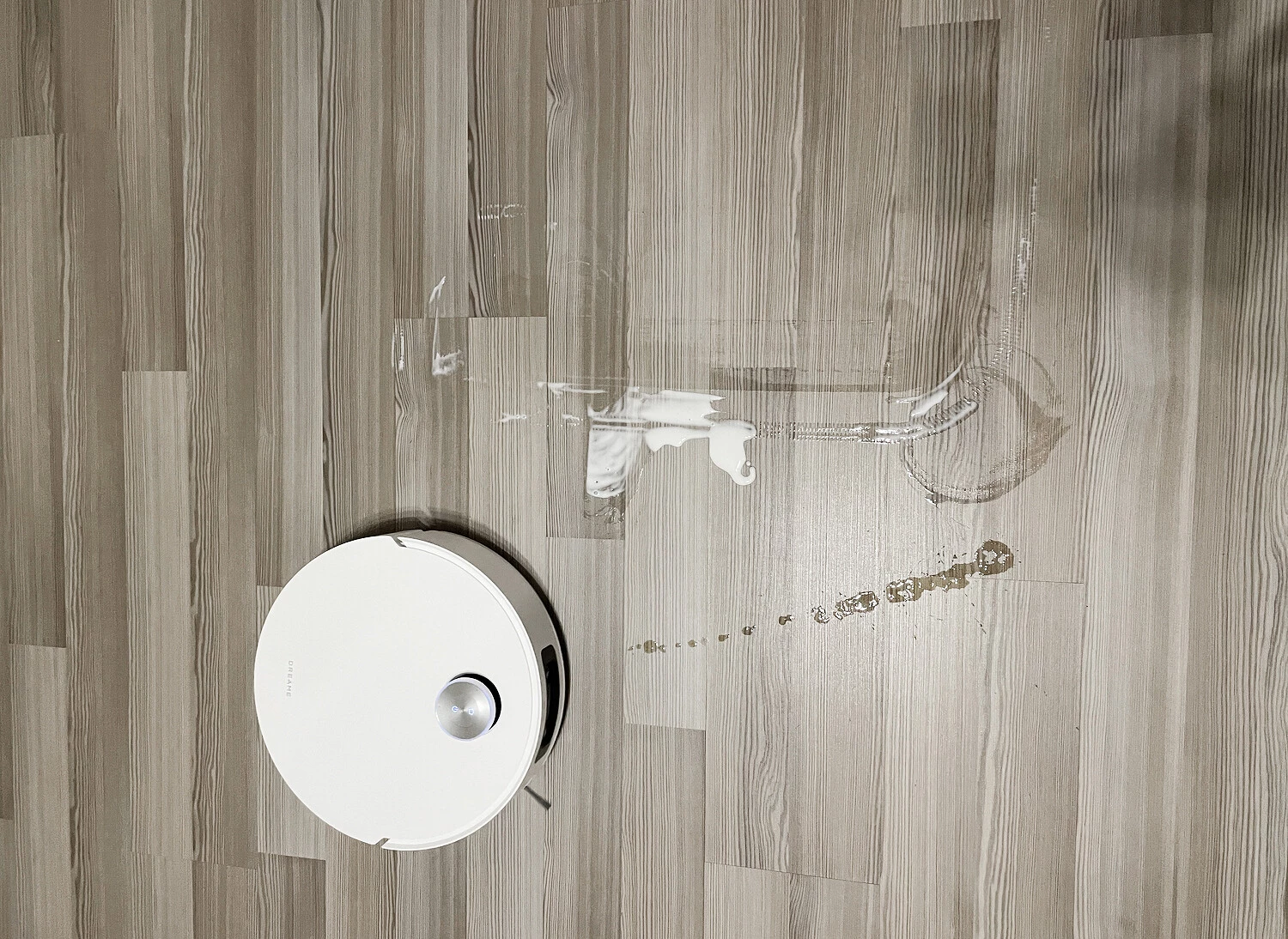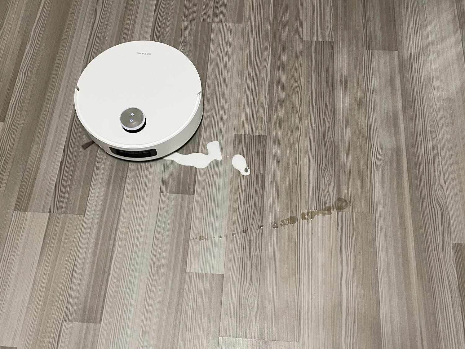 Чтобы оценить качество влажной уборки в «полевых» условиях, мы оставили на ламинате пятна от йогурта и кофе. Dreame Aqua10 Ultra Roller Complete действительно без проблем с ними справился, однако для тех мест, где загрязнения были нанесены более плотным слоем, пришлось запустить дополнительно точечную уборку.