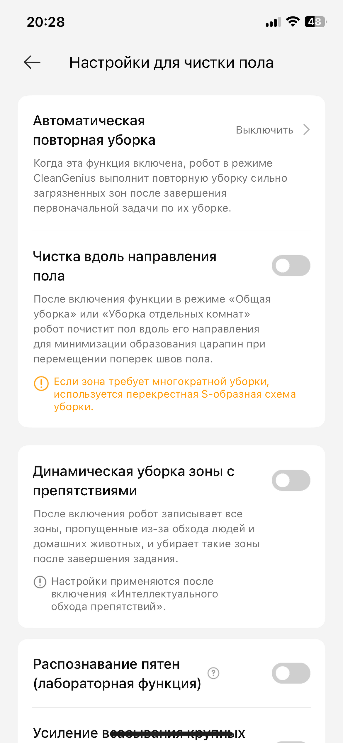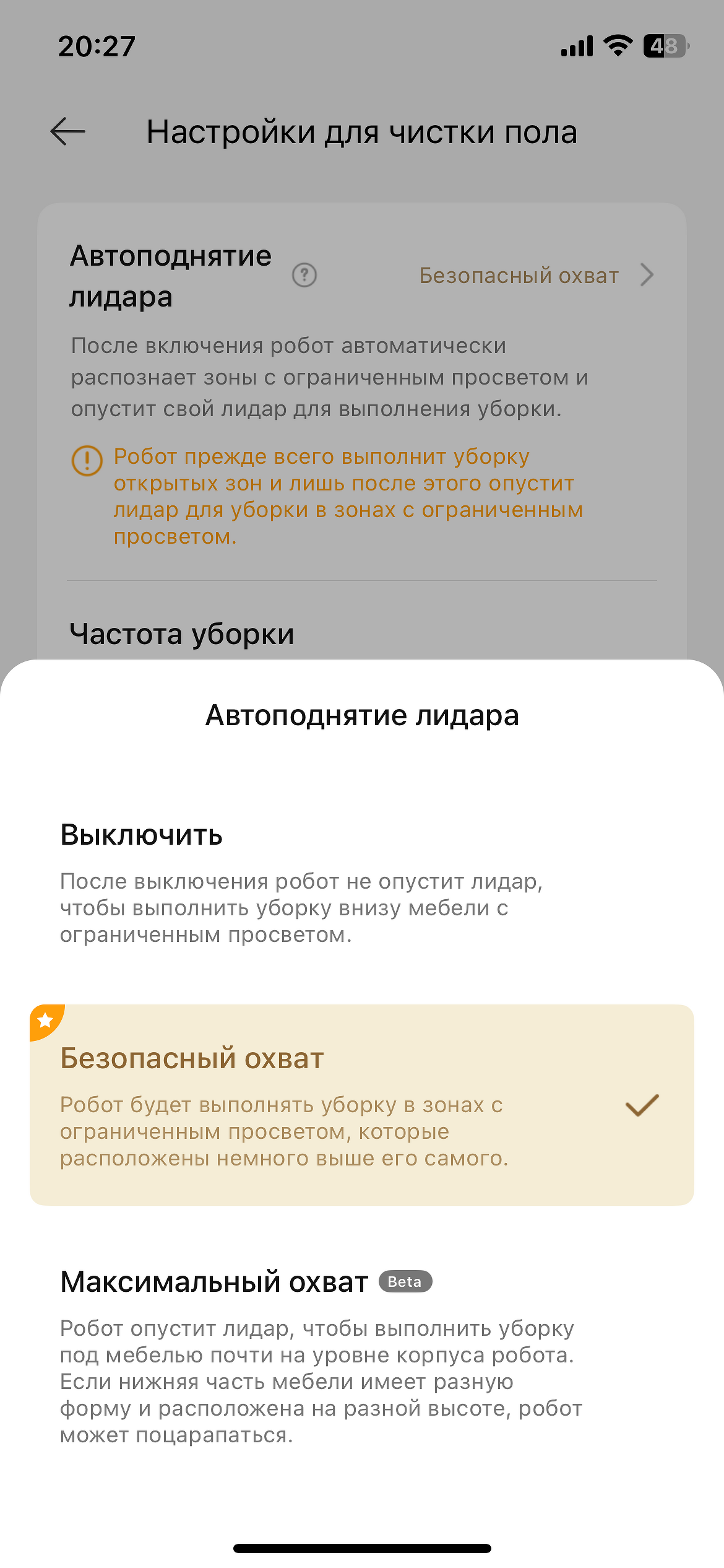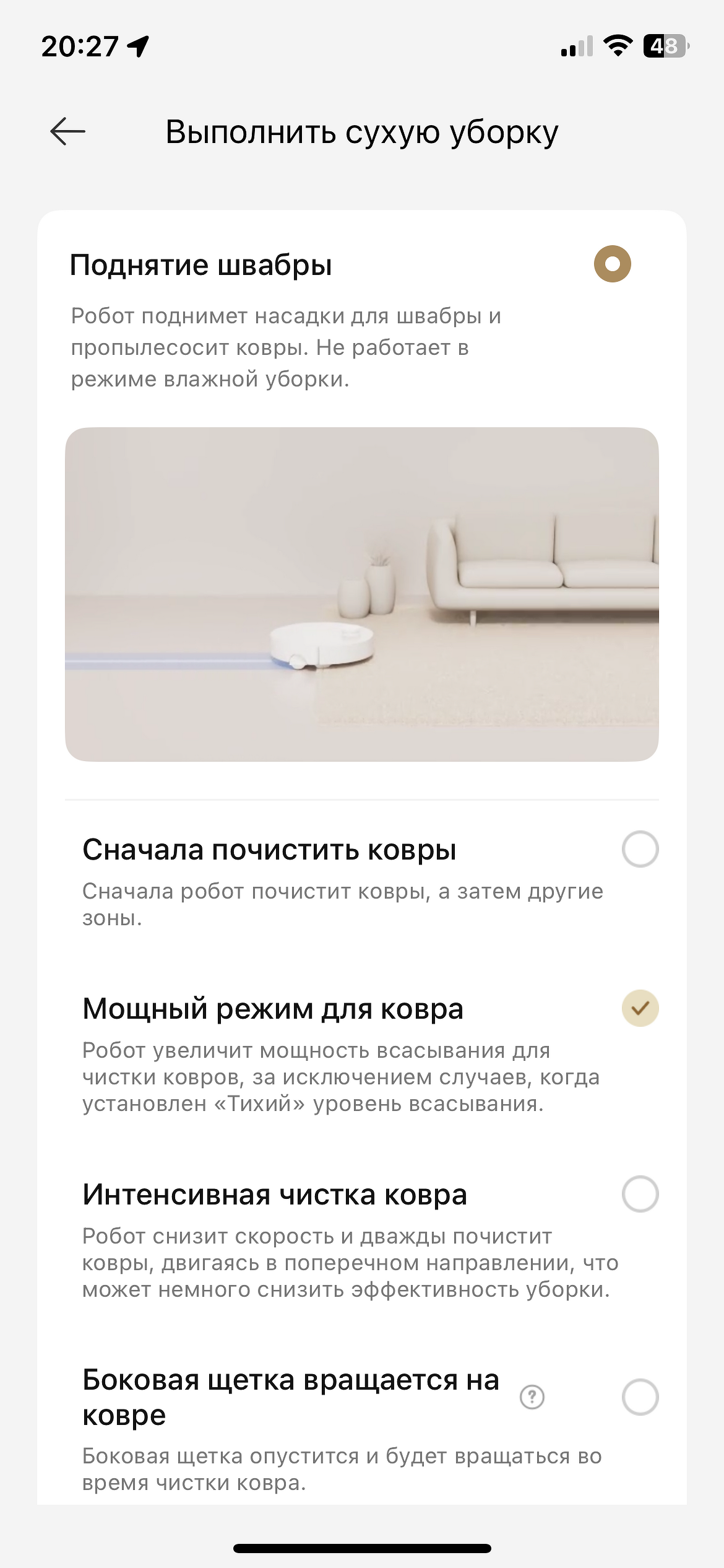 - настроить параметры сухой уборки — автоподнятие лидара, уборка пропущенных зон, распознавание пятен и др.;