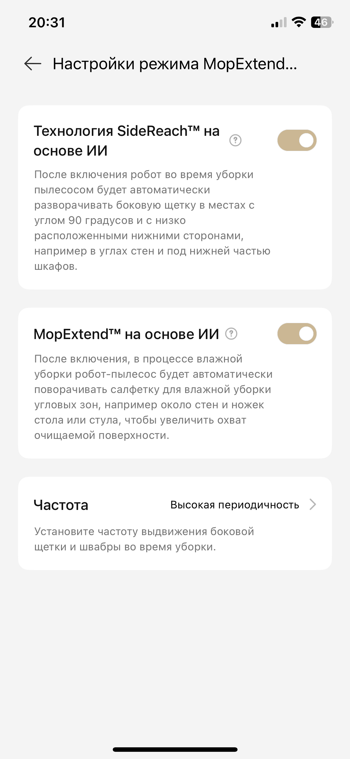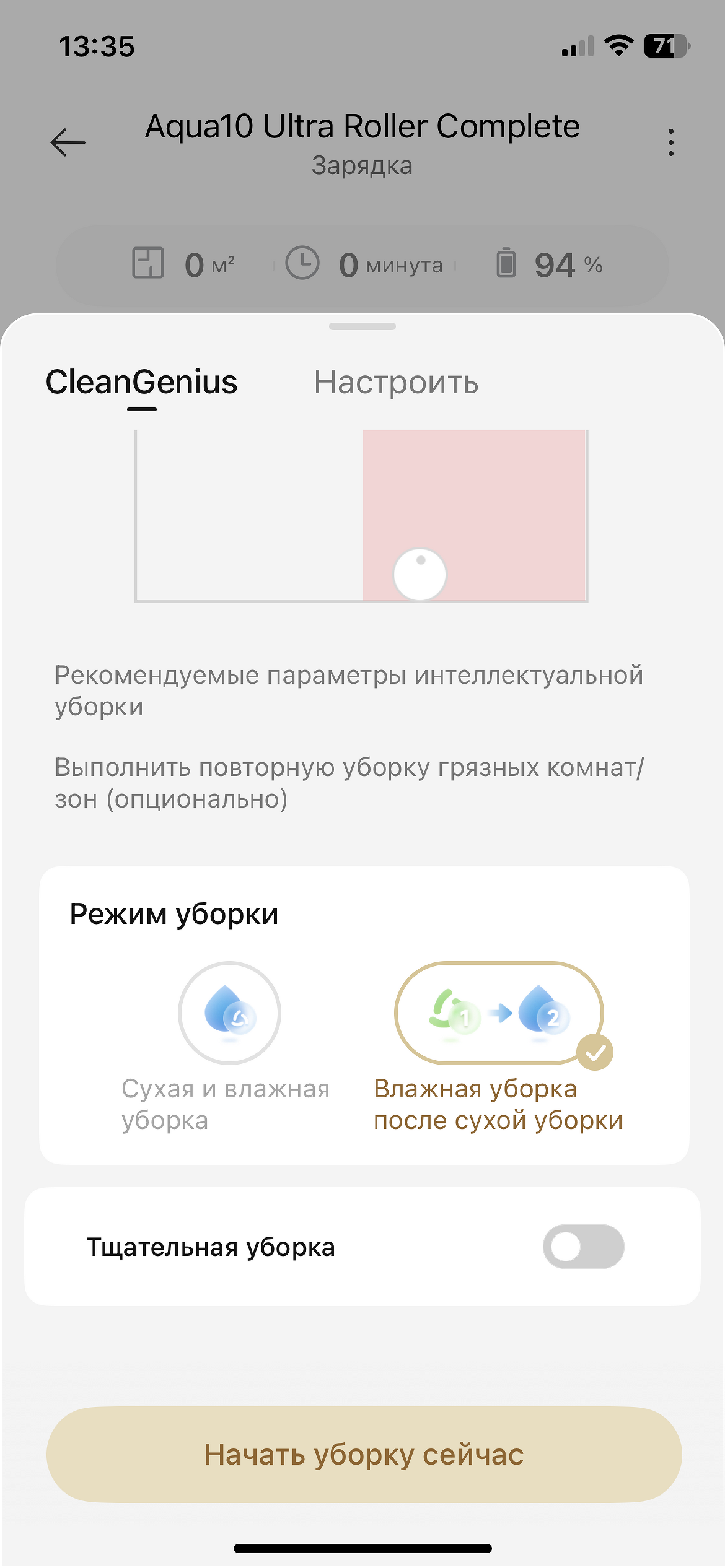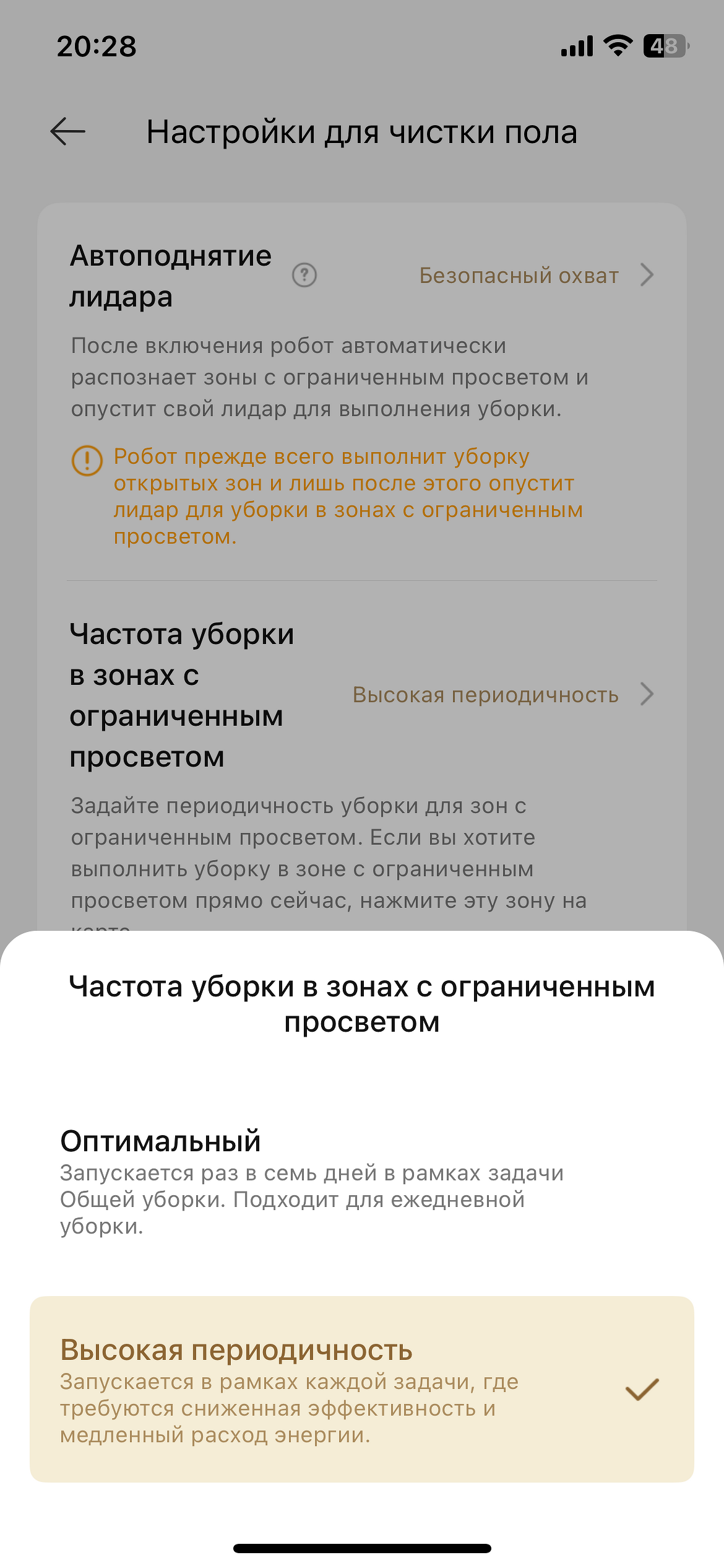 - настроить параметры сухой уборки — автоподнятие лидара, уборка пропущенных зон, распознавание пятен и др.;