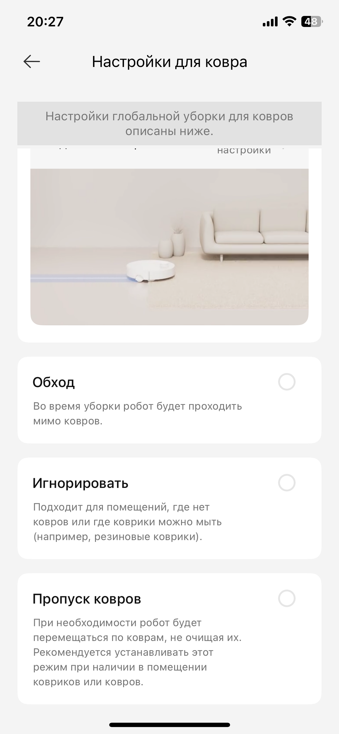 - выставить тонкие настройки для ковров (объезжать, игнорировать, пропускать, выбрать режим мощности, подключение боковой щетки, подъем шасси и т.д.);