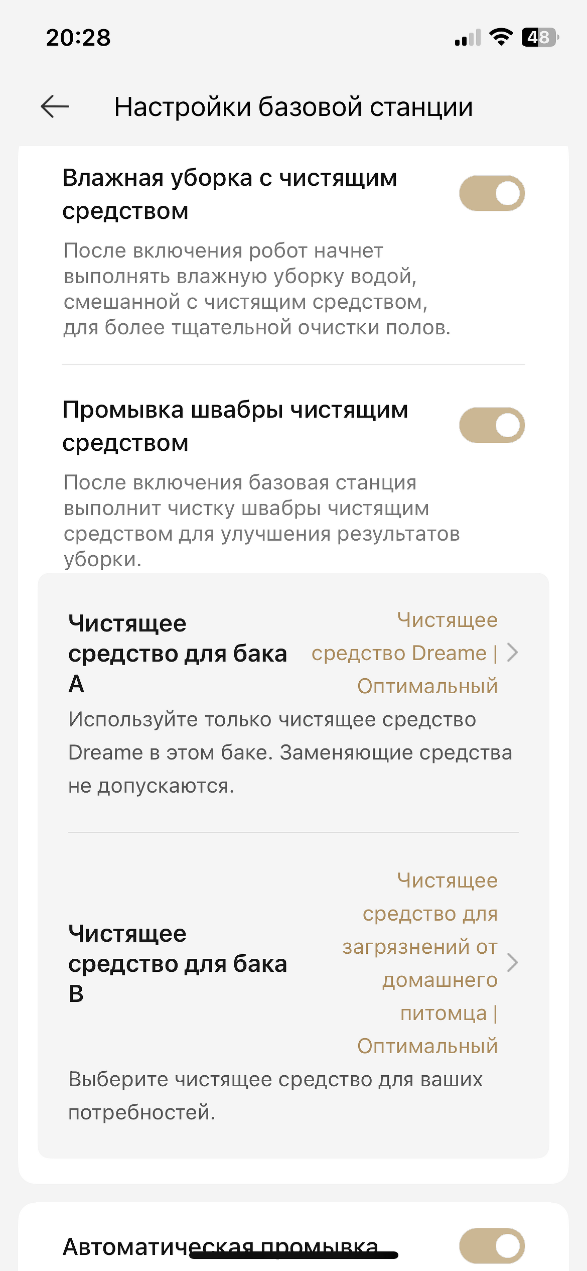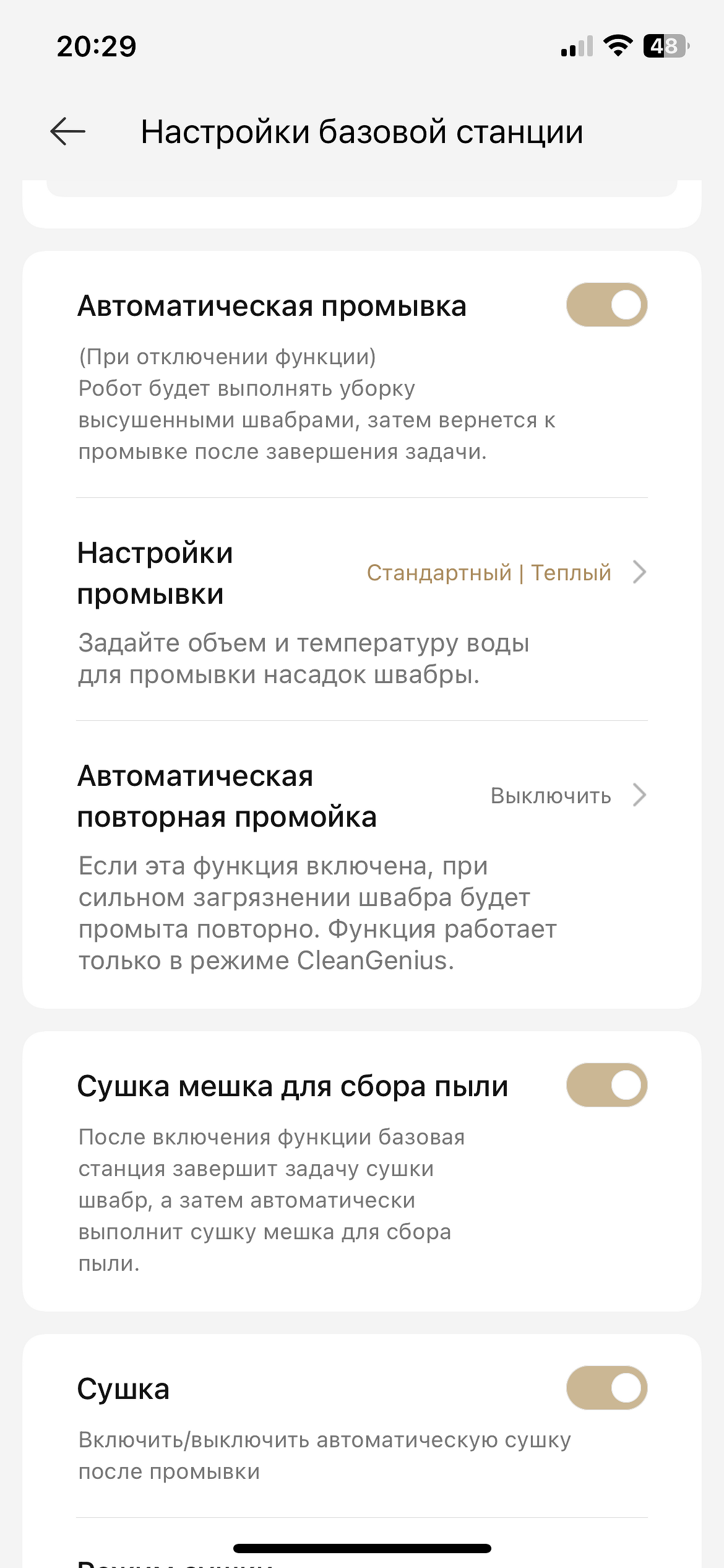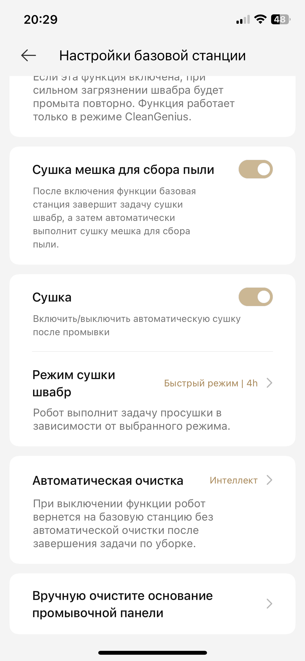 Что касается базовой станции, то в этом разделе можно выбрать длительность сушки швабры, включить сушку мышка для пыли, настроить промывку роликовой швабры — температуру и расход воды и так далее.