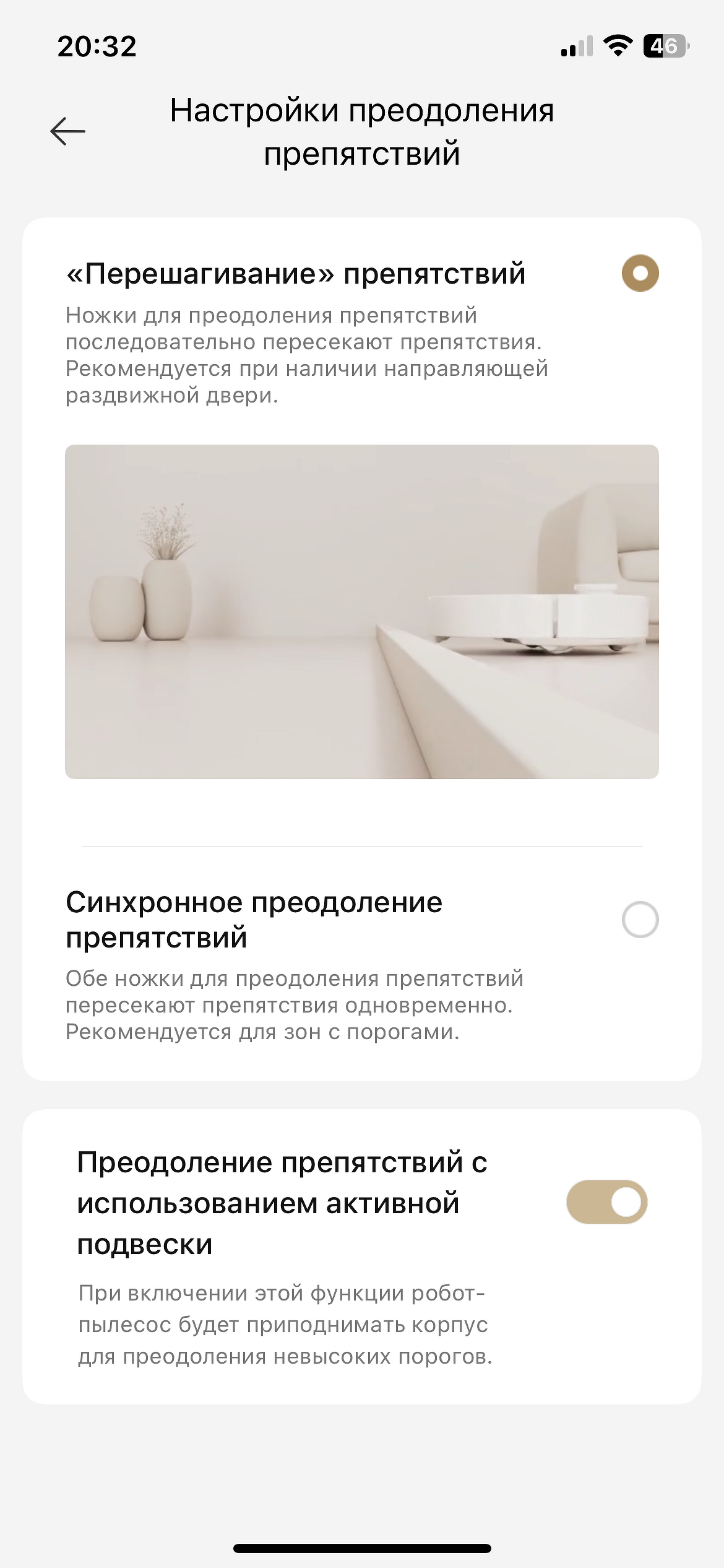 Дополнительные опоры, которые выдвигаются для преодоления порогов и приподнимают часть корпуса над полом, значительно облегчают уборку. Dreame Aqua10 Ultra Roller Complete может преодолевать пороги высотой до 4,2 см, а составные — так и вовсе до 8 см в высоту. А еще робот переезжает горизонтальные П-образные ножки, а не путается в них — шасси для этого приподнимается на трех колесах. В нашем случае пылесос справился с ножками от сушилки и заехал на скрученный ковер — сначала покрутился вокруг, «оценивая» препятствие, затем поочередно зашел на подъем обеими ножками и перевалился на пол.