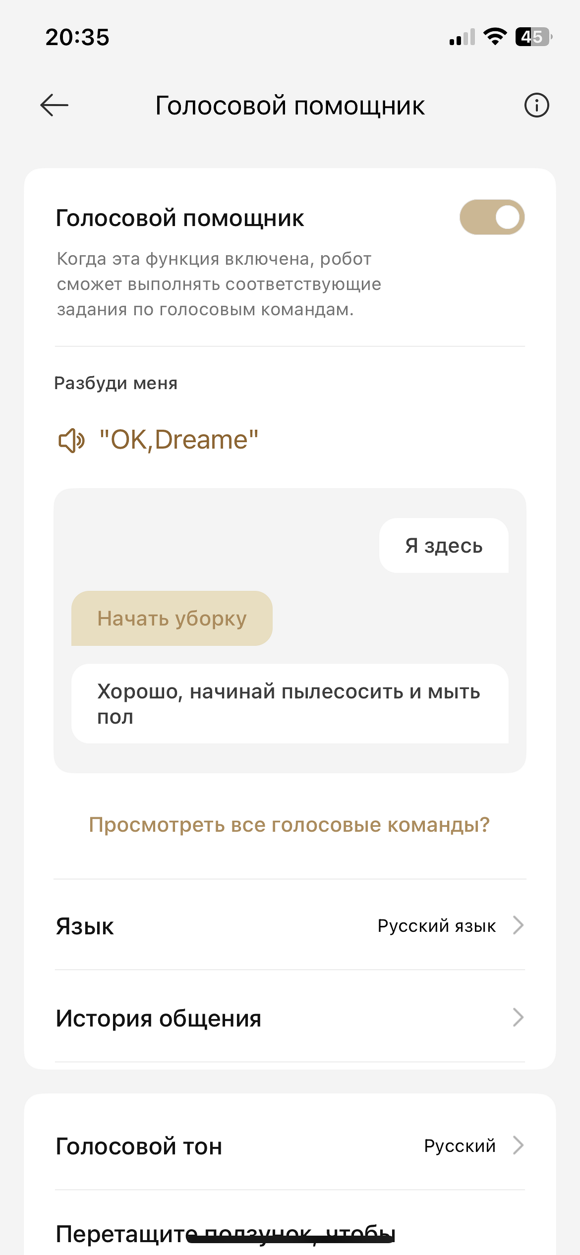 Конечно, Dreamehome подключается к умному дому Яндекса и запускать уборку можно и при помощи Алисы. Фирменный голосовой помощник тоже хорошо понимает команды. Можно сказать «OK, Dreame!», пылесос отзовется «Я здесь» — и дальше отдаете указание, например, «Начни уборку!», «Уберись в прихожей», «Убери здесь» и т.д. В последнем случае пылесос сам определяет, где вы стоите, и выполняет точечную уборку.