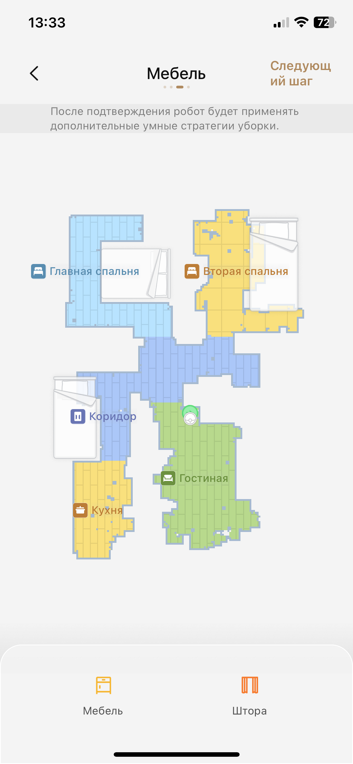 При первом запуске робот составляет карту помещения. Ее можно редактировать, разбивать на зоны, уточнять какие-то моменты вроде ковров, объединять комнаты и так далее. В нашем случае делать не пришлось ничего, кроме объединения двух зон прихожей со сложной геометрией в одну. А так робот четко распознал две спальни и гостиную, кухню, санузел и прихожую.