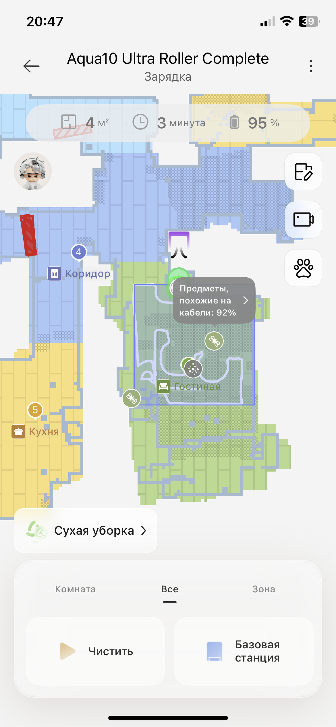 Сначала Dreame Aqua10 Ultra Roller Complete убирает по периметру комнаты, затем едет к центру. Помещение площадью 26 мІ пылесос убирает за 45-50 минут и тратит около 30% заряда.