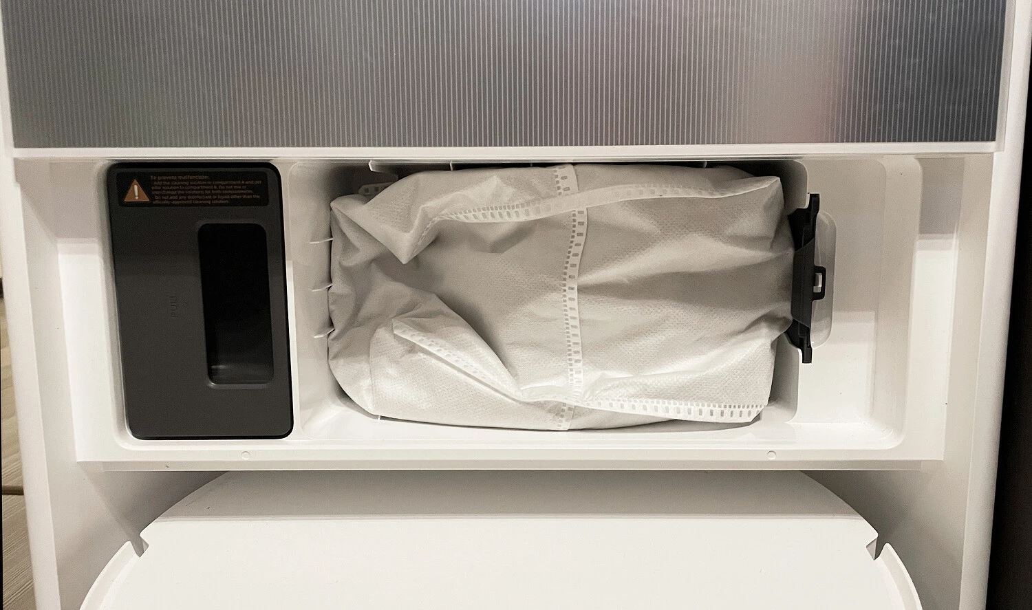 Мусорный мешок объемом 3,2 литра очень просто крепится внутри. Сюда собирается мусор после каждой уборки или прямо в процессе, если контейнер в самом роботе переполнился. Такого мешка должно хватить на период до 100 дней, но если дома очень пыльно, например, вы живете возле проезжей части, то мешок, возможно, придется заменить раньше. Для аллергиков актуально, что при смене мешка отверстие закрывается заглушкой, чтобы аллергены не попадали в воздух. Также отметим, что в отсеке, где находится мешок, есть вентилятор, который подает воздушный поток с температурой 50 °C, чтобы не разводить запахи и сырость.