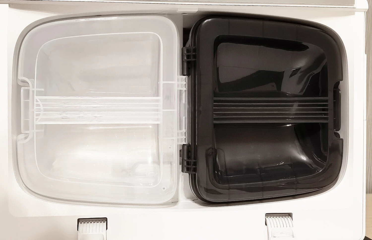 Снаружи станция напоминает аккуратную лаконичную тумбу. Под крышкой, которая откидывается одним движением, находятся баки с чистой и отработанной водой объемом 4 и 3,5 литра соответственно.