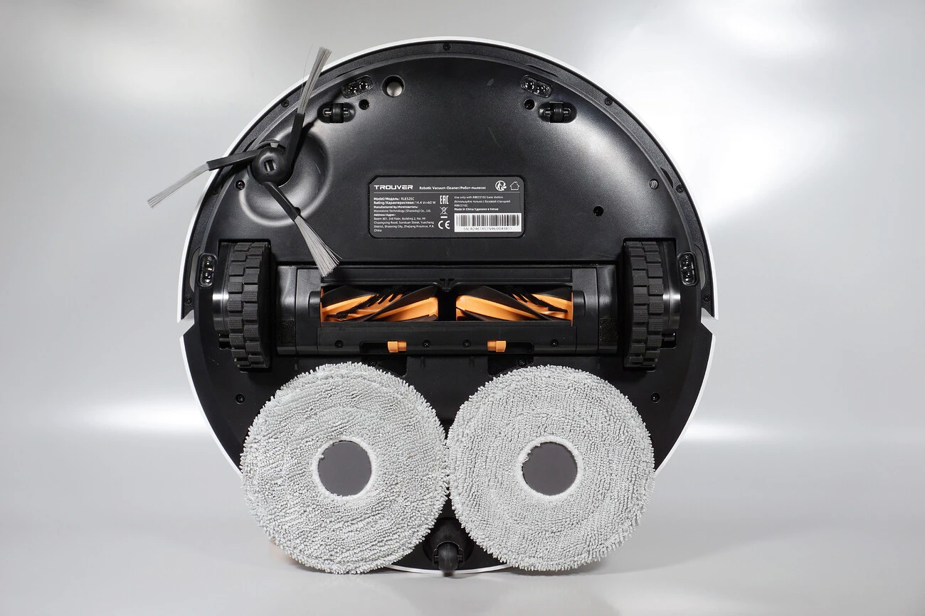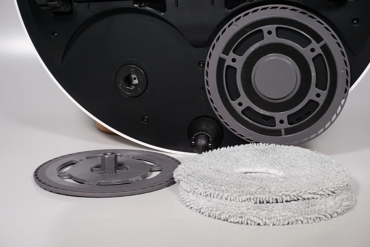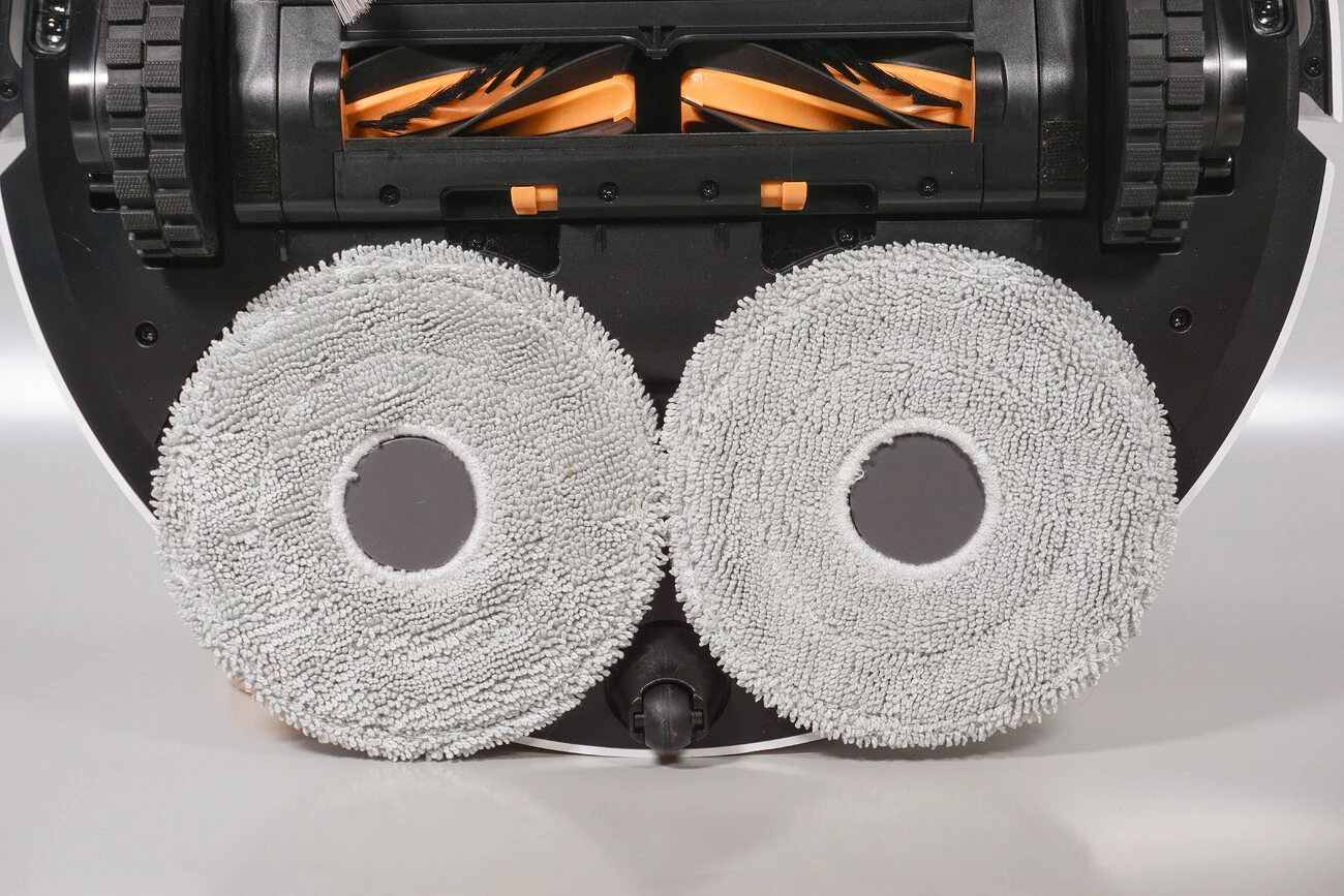 - Влажная уборка стандартным образом выполняется с помощью двух вращающихся салфеток из микрофибры. Эти мягкие, но эффективные «руки» робота не просто смачивают поверхность — они активно полируют ее, удаляя загрязнения и пятна, оставляя после себя чистый пол без разводов.