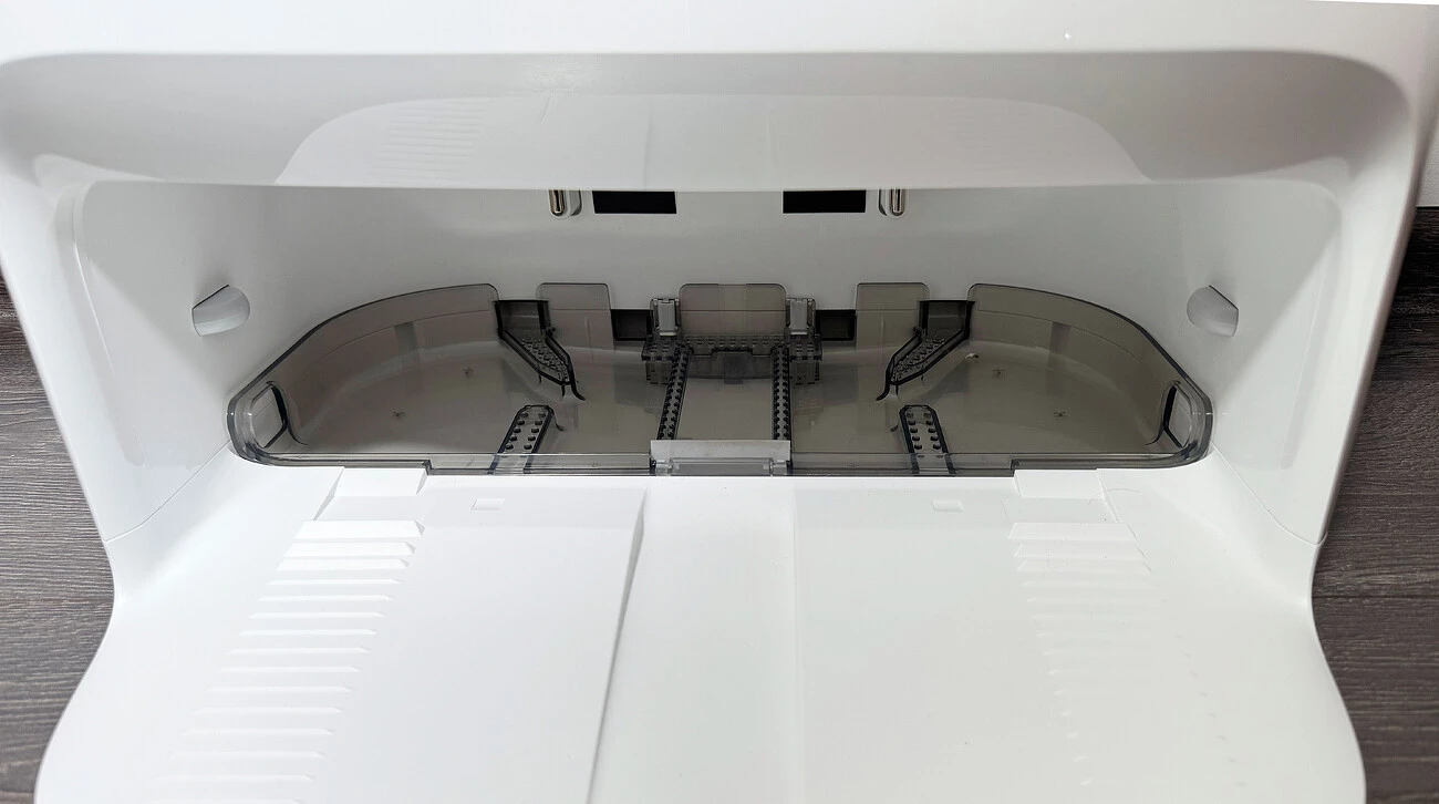 Под крышкой док-станции привычно скрываются два пластиковых съемных бака: для чистой воды и для отработанной. Объемные резервуары обеспечивают длительную автономную работу. Резервуар для чистой воды вмещает 4 л, для использованной — 3,5 л, что достаточно для уборки обширных площадей без дозаправки.