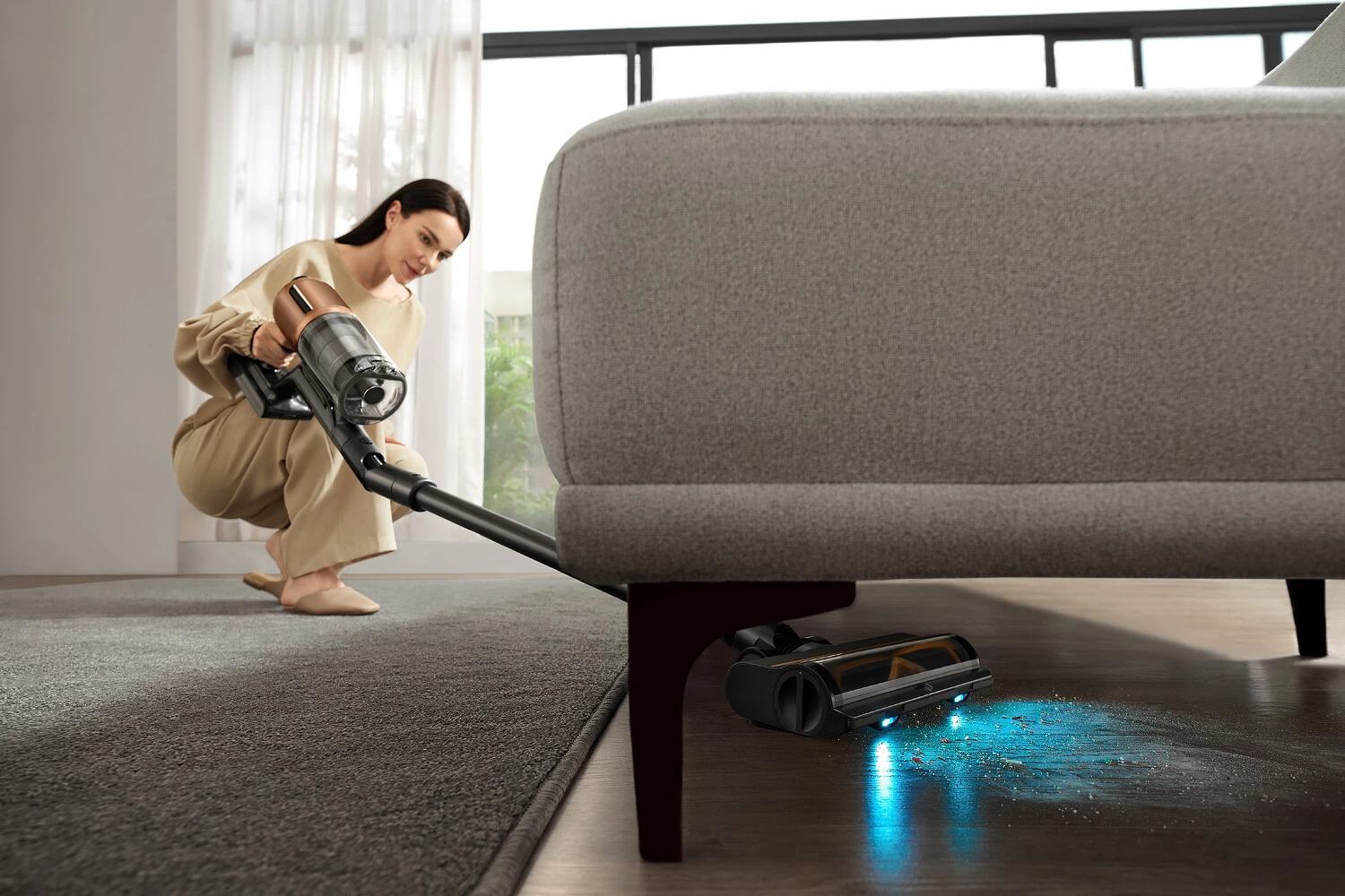 Ручка пылесоса наклоняется на все 180 градусов, так что пылесос может буквально «лечь» на пол и заехать под низкую мебель, в просветы высотой от 14 см, — и при этом не терять в силе всасывания. На моющем блоке есть колеса GlideWheel™ — они позволяют перемещать устройство легко и без усилий.