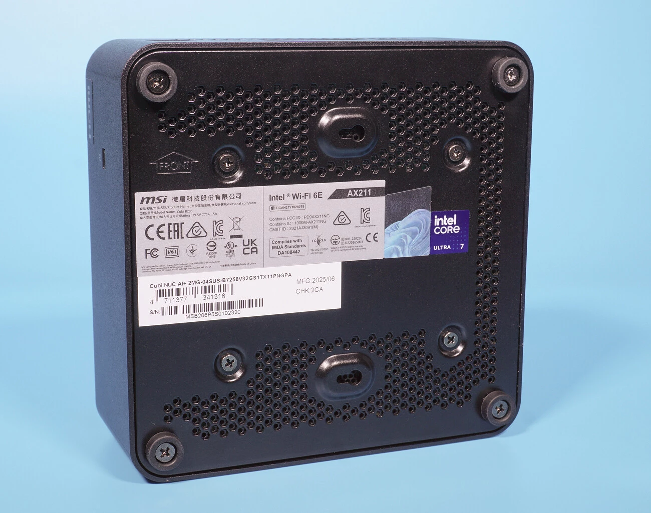 Внешне MSI Cubi NUC AI+ выглядит как типичный представитель класса мини?ПК: строгий прямоугольный корпус без вычурных элементов. Материал — переработанный пластик (37,25 % состава), что можно расценить как шаг в сторону экологичности. Поверхность матовая, устойчива к мелким царапинам.