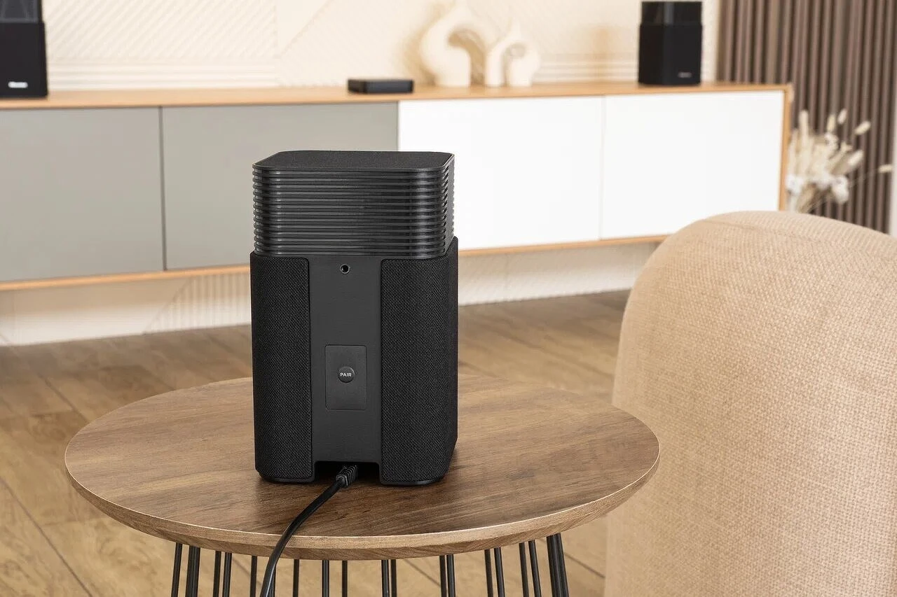 Сабвуфер выполнен в одном стиле с колонками, но уже без решеток. Снизу расположен излучатель, сзади — фазоинвертор, разъем для подключения питания и кнопка для сопряжения.