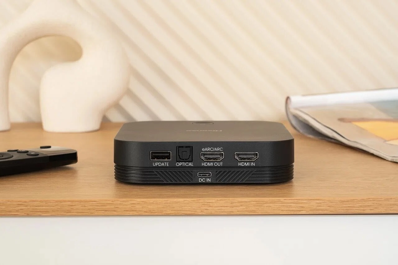 За обработку звука отвечает выделенный сигнальный процессор с поддержкой всех популярных кодеков, а для подключения внешних устройств предусмотрены входы HDMI eARC и HDMI, оптический вход, USB Type-A для установки обновлений и USB Type-C. Такое многообразие способствует комфортной работе с большинством устройств. Сверху на корпусе находится кнопка питания/переключения между источниками.