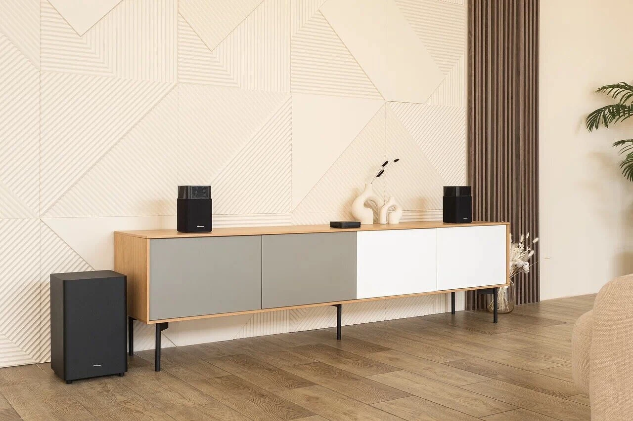 Также производитель реализовал и собственные разработки. При подключении к телевизору Hisense алгоритмы ИИ анализируют акустические свойства помещения, и система самостоятельно настраивает параметры воспроизведения звука. Таким образом удается добиться объемного качественного звучания и в небольшой спальне, и в просторной гостиной, не прилагая к этому особых усилий.