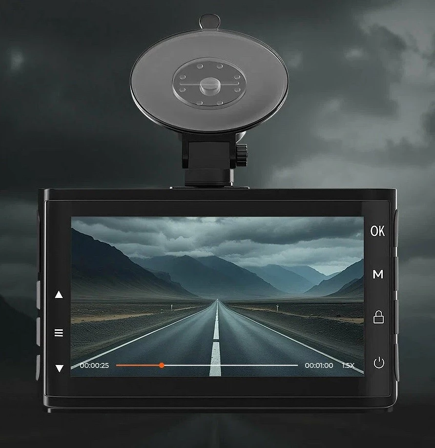 Камера с углом обзора 170° записывает видео в формате 4K UHD. Картинка сразу выводится на 3-дюймовый цветной IPS-экран: на нем отображаются номера автомобилей, даты, координаты и скорость.