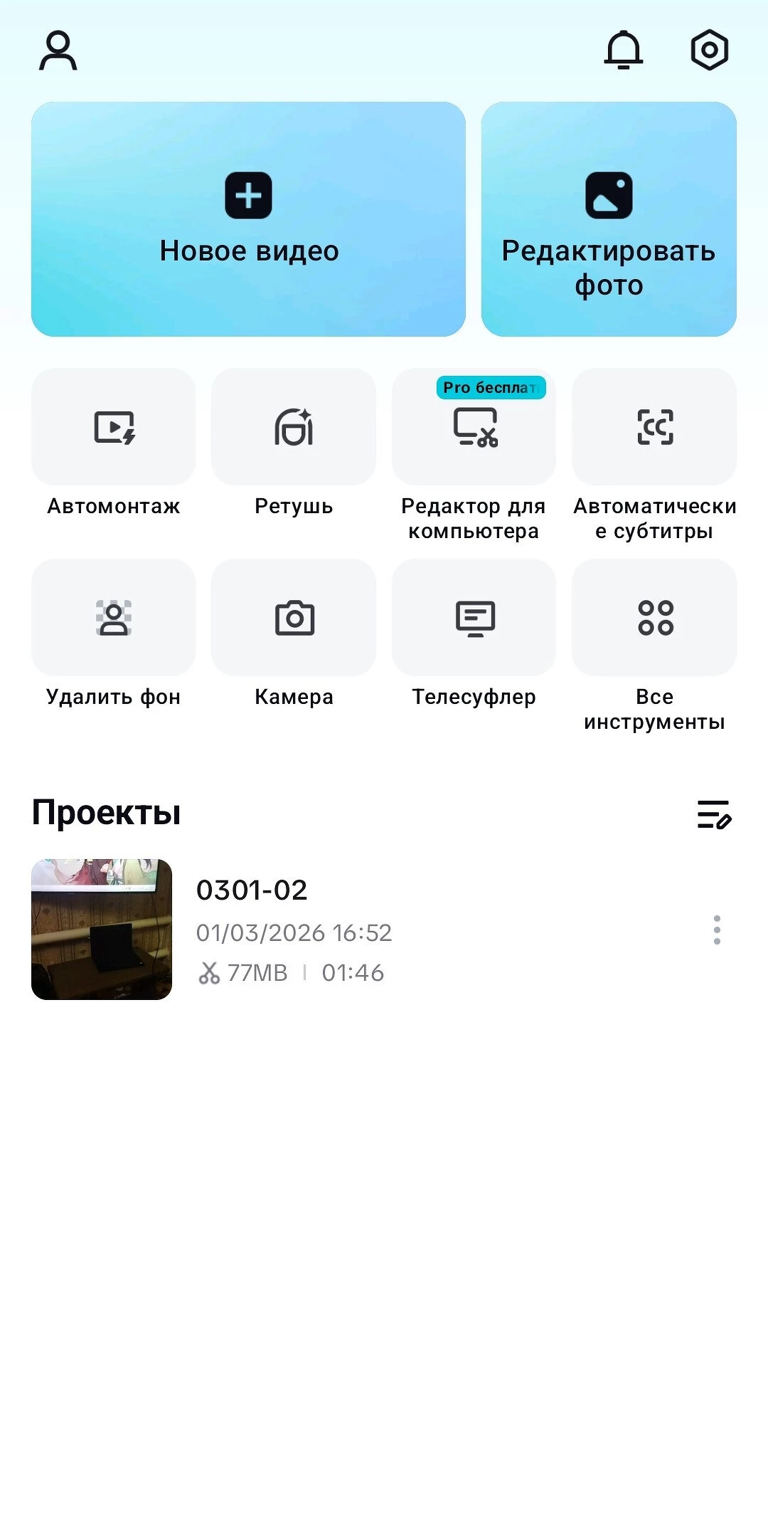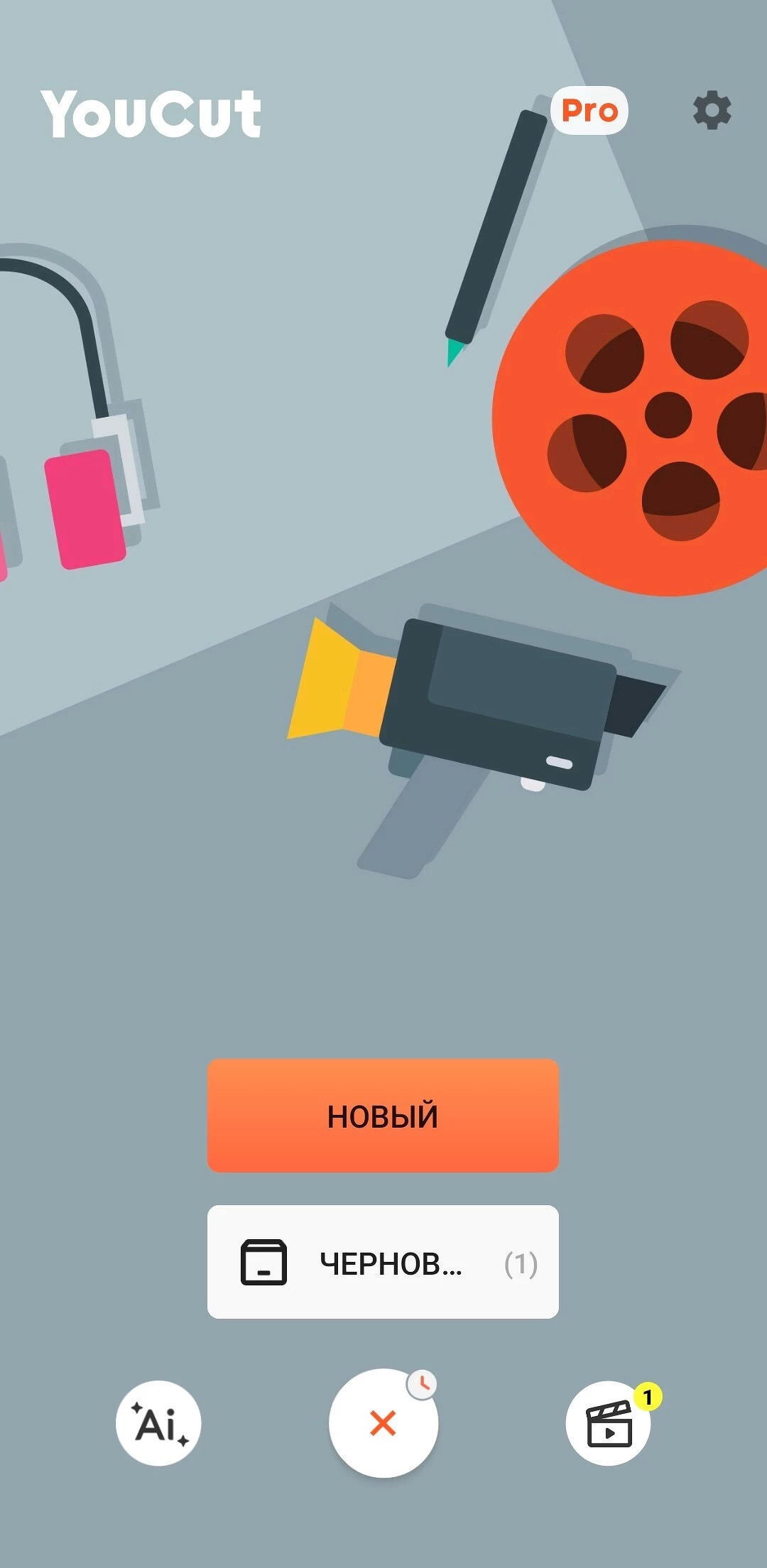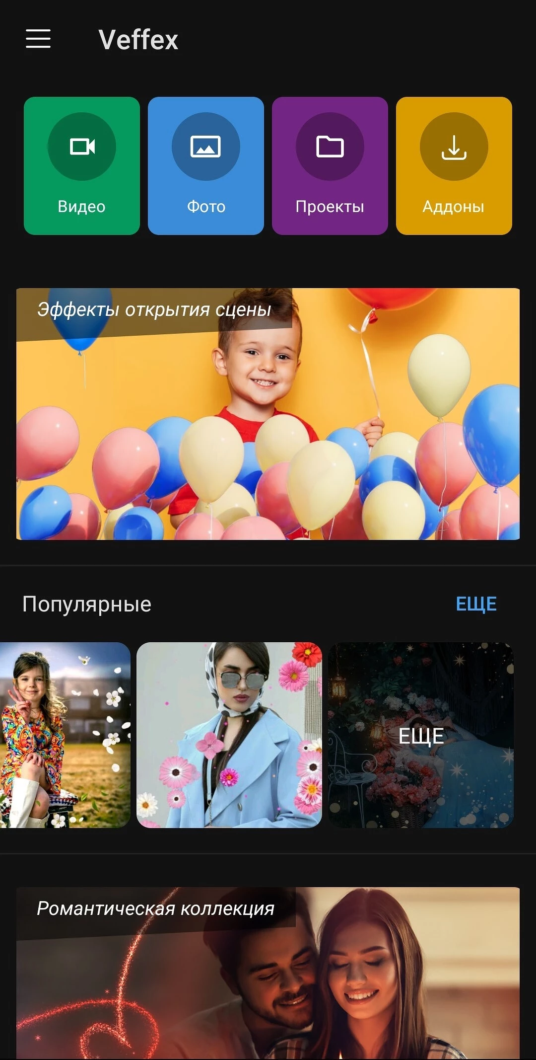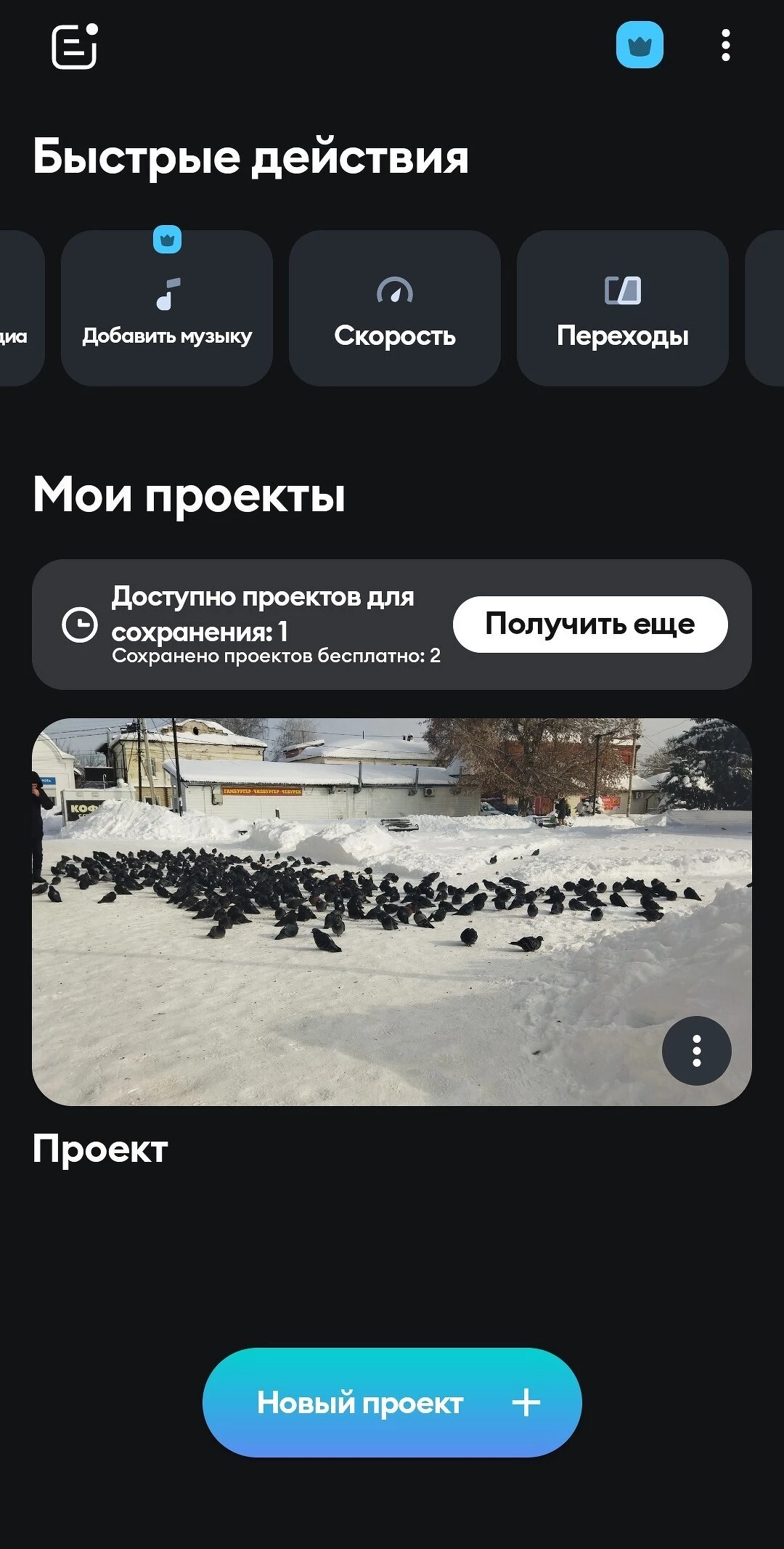 В главном разделе располагаются начатые проекты, здесь же можно создавать новые видео или фотоколлажи.