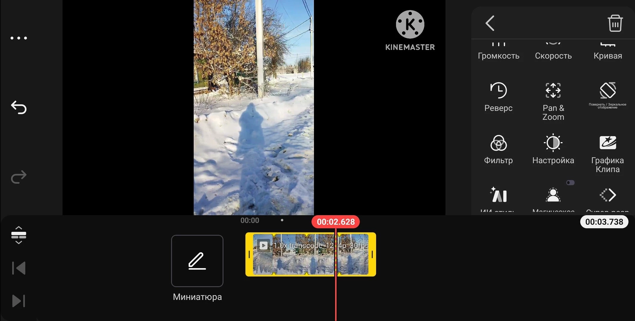 В отличие от других приложений, в Kinemaster режим редактирования запускается в горизонтальной ориентации экрана. Именно так монтировать видео гораздо удобнее, особенно при работе с несколькими слоями. В Kinemaster есть множество функций, которых нет в других редакторах, например, кривые, реверс, магическое удаление объектов, извлечение оригинального аудио и перекодирование.