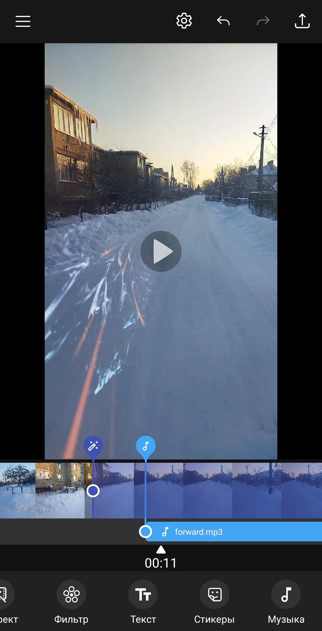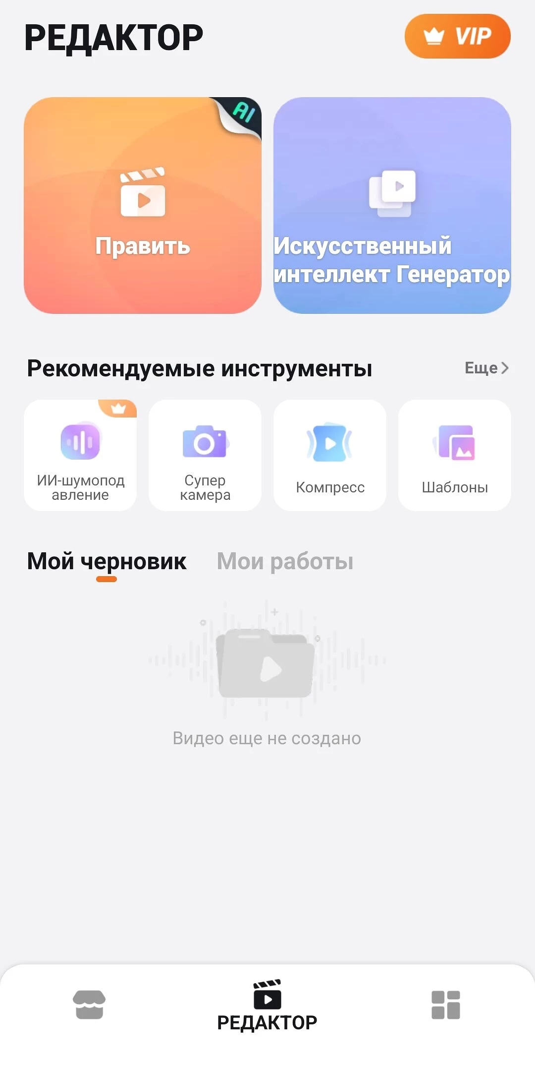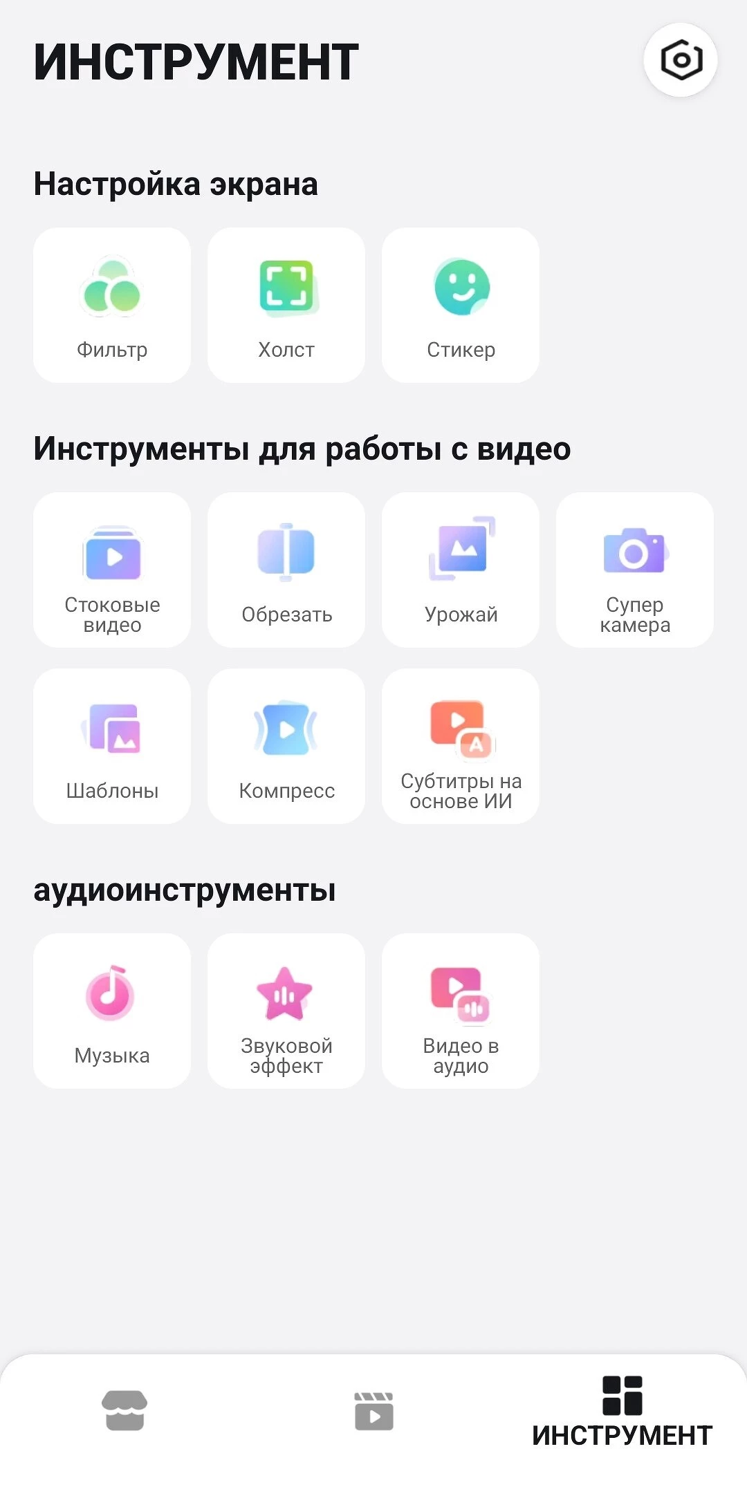 Во вкладке "Инструменты" можно редактировать готовое видео без необходимости открывать редактор, например, обрезать видеодорожку, сжать видео, добавить стикер или фильтр.