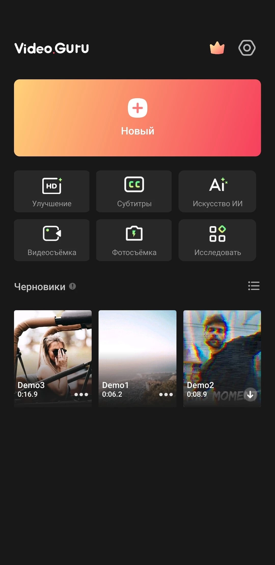 На главном экране размещены три демо-видео, которые демонстрируют все возможности видеоредактора. Пользователь может изучить интерфейс, протестировать функции и понять, подходит ли ему приложение.